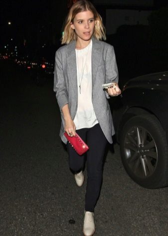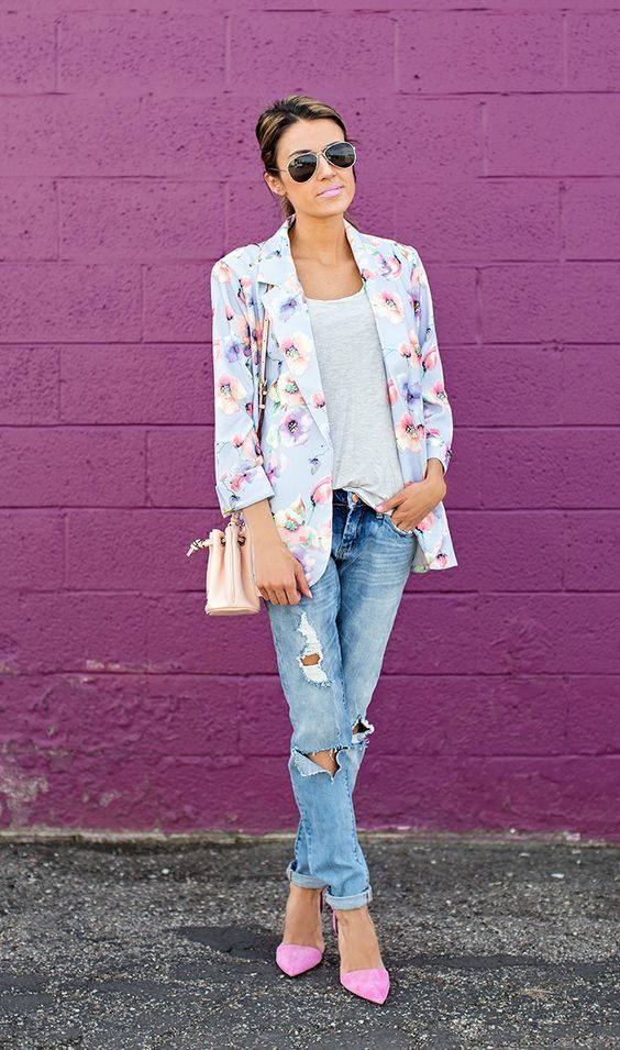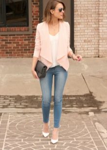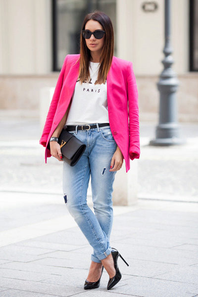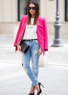 Pink jacket will help to create a summer casual look. It can be combined with a white T-shirt, blouse, light shirt. If you go to a party, put on high-heeled shoes and complement the image with a clutch.
