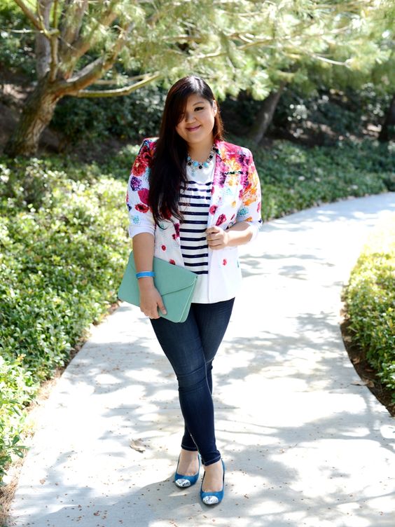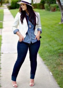 Girls with odds, regardless of the type of figure, should pay attention to the elongated models that hide problem hips and visually make you slimmer. It is better to wear the jacket unbuttoned, because the vertical lines will further stretch your silhouette. As for jeans, choose models with medium fit, without appliqués and large patterns.
