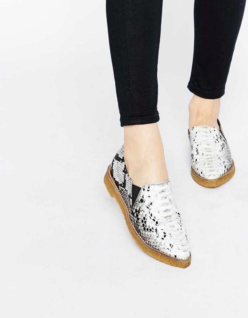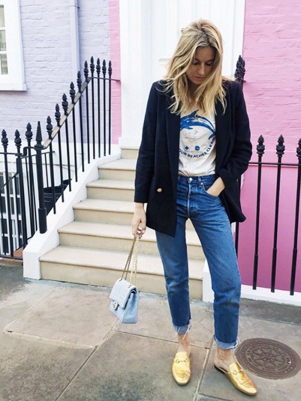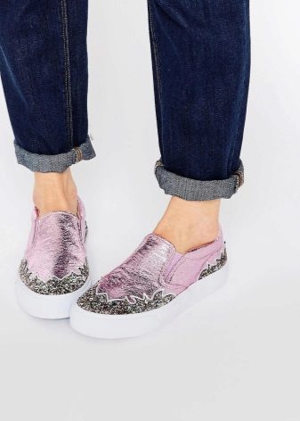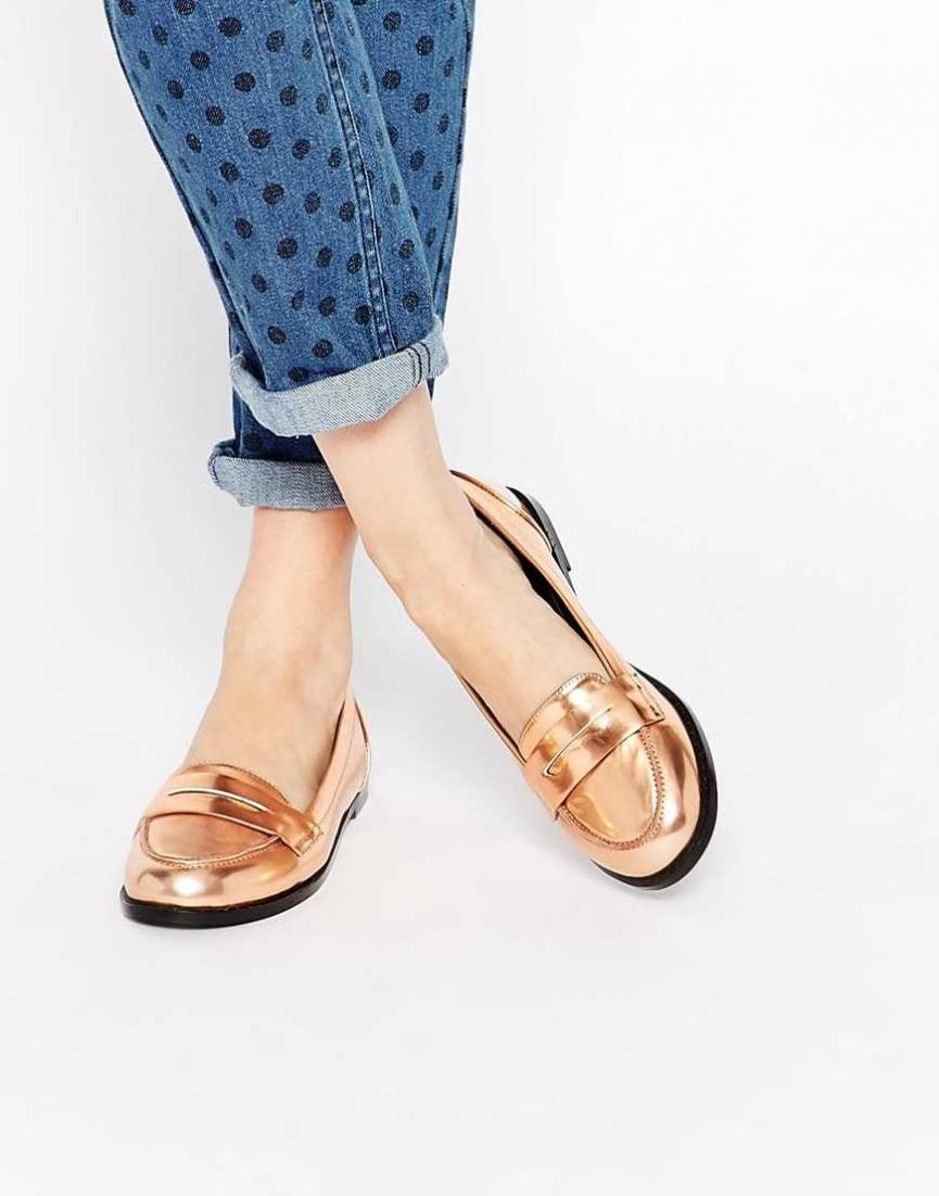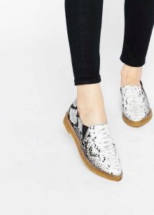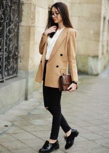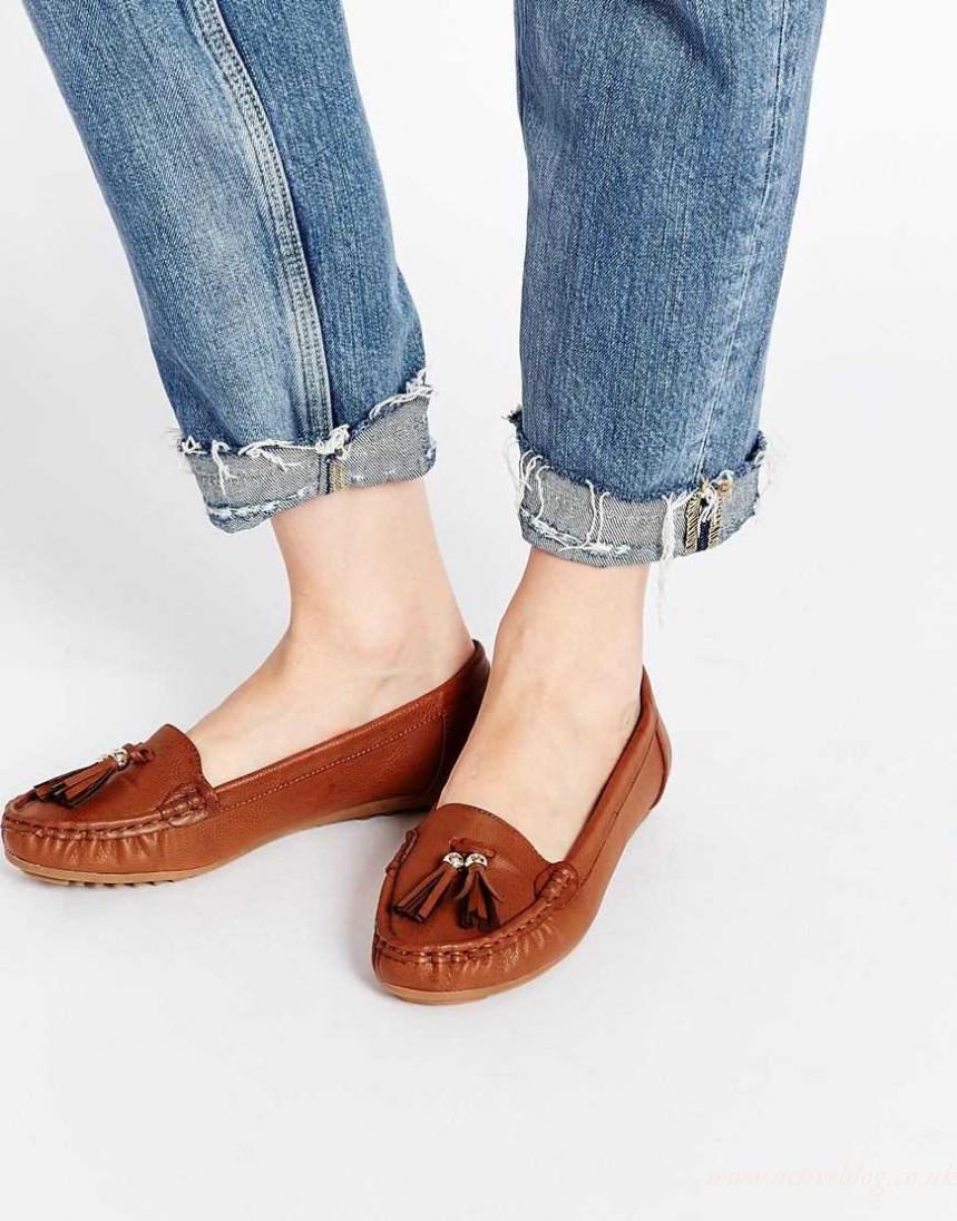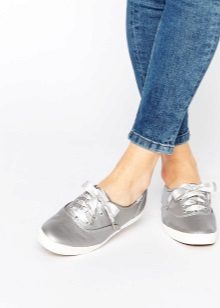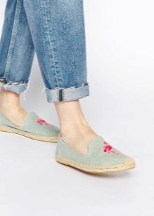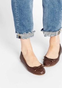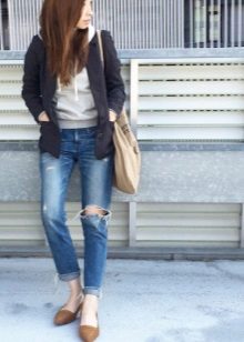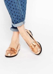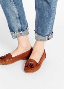 Virtually any shoes without heels will help to create a decent image in tandem with jeans and a jacket. It can be moccasins, oxfords, loafers, ballet flats, creepers, slipona.
