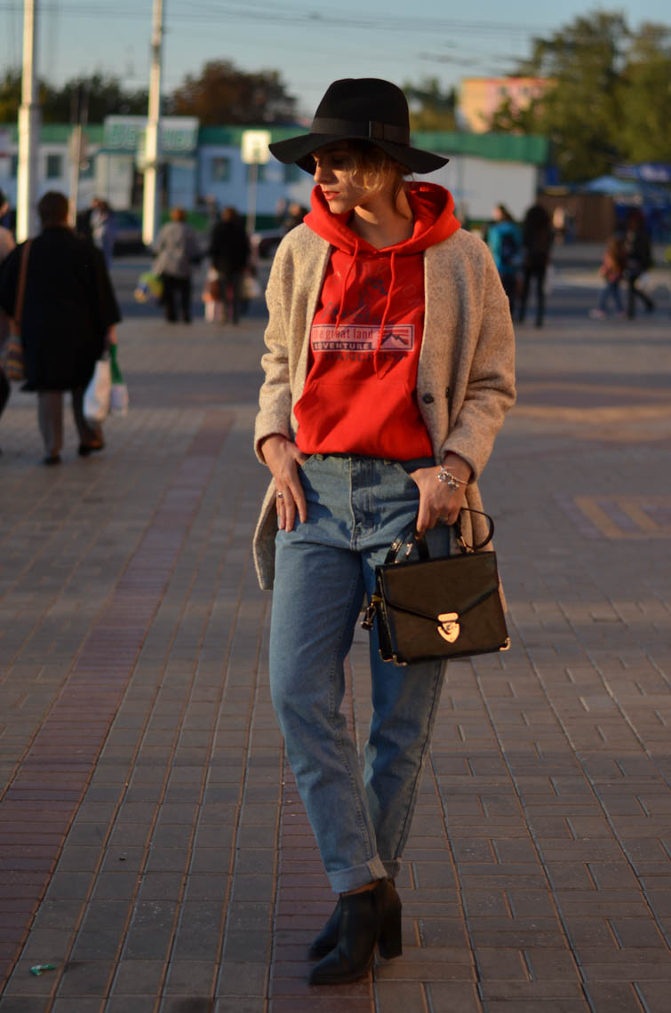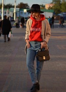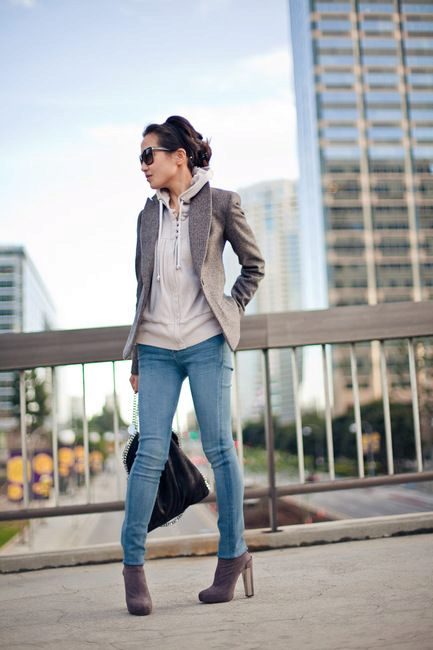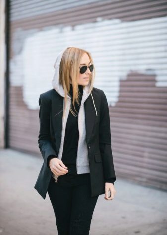 Do not be afraid to combine a jacket with a sweatshirt. You will have a stylish and comfortable casual look, which is suitable for every day. Do not forget to choose a free elongated jacket that will sit properly and not look as if it is too small for you. Take the hood out of the jacket collar and allow yourself not to think about the rules.