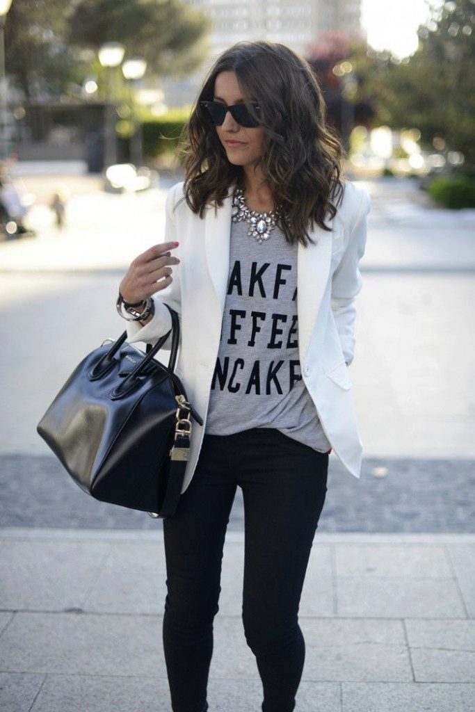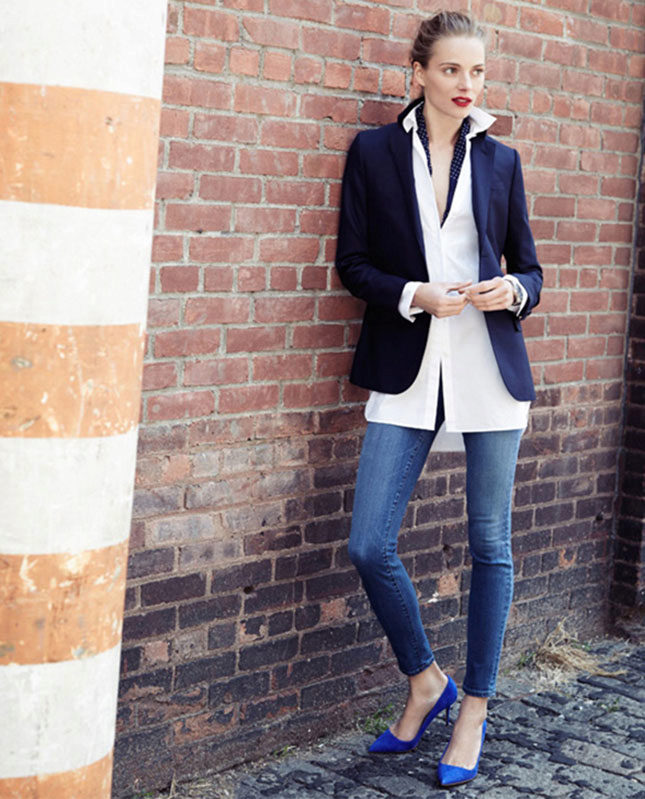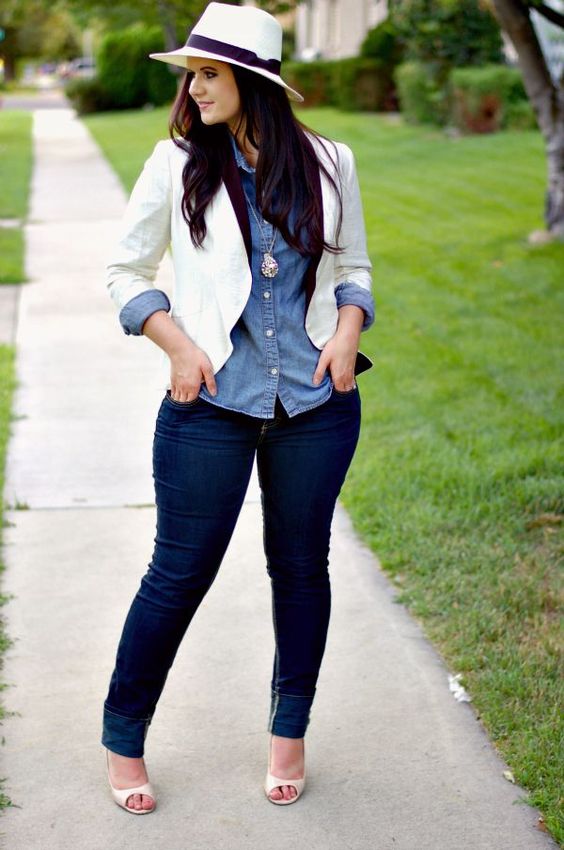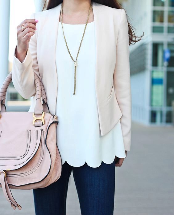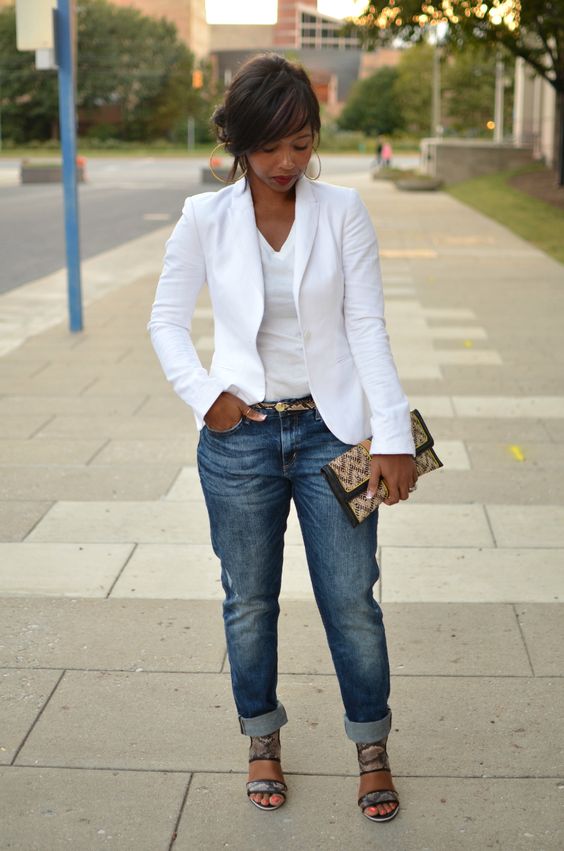 A strict jacket with classic jeans and a shirt is an excellent set for office work. In this case, white is also a win-win option, but a blue, beige, and cream-colored shirt will also work.