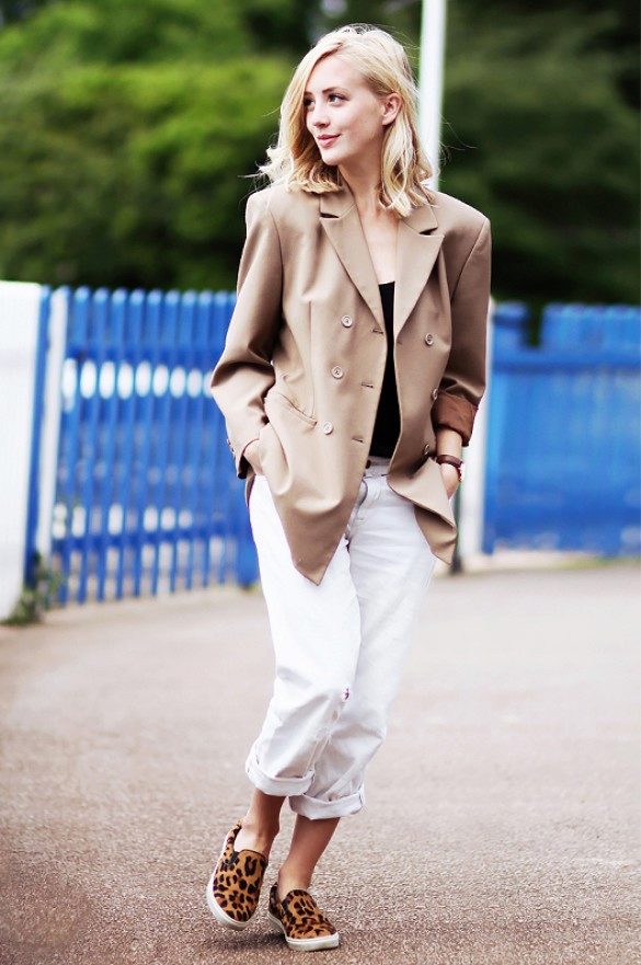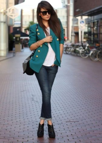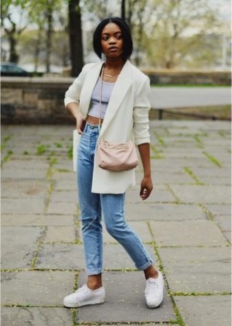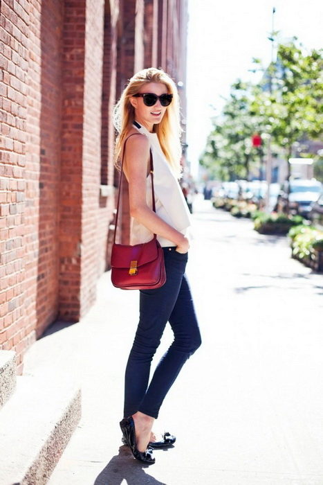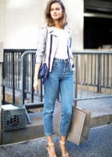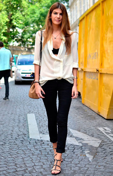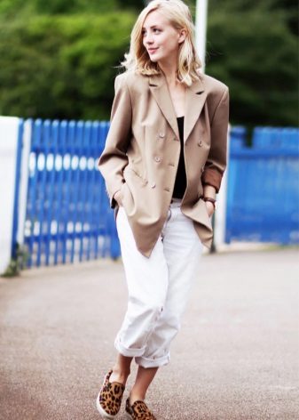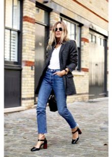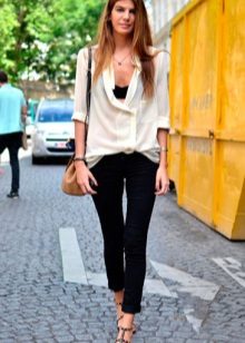 A feminine look will create a tandem of black cropped jeans with a white blouse. The decoration will be exquisite sandals decorated with beads. Jacket of a male cut of a light shade will help to add stylishness.