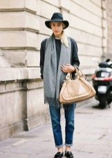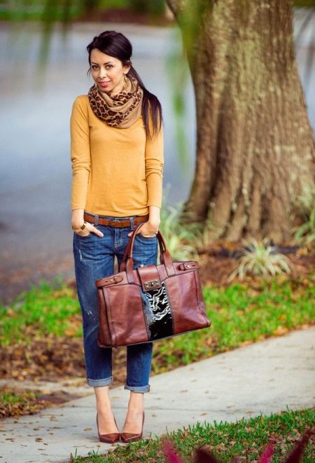 A combination of cropped blue jeans with a yellow jacket and a leopard scarf looks elegant. A stylish strap will add brightness to the image, and elegant shoes with a brown heel and a large bag in the tone of shoes will be a luxurious addition.