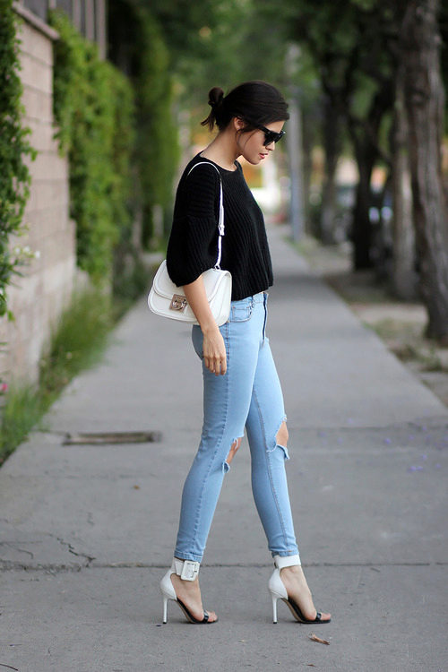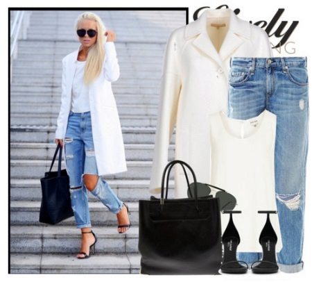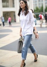 Shortened jeans with holes in an ensemble with stiletto sandals, a snow-white tunic and a white elegant coat look very impressive. The black bag of a large size ideally complements a stylish bow.