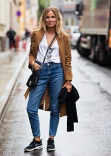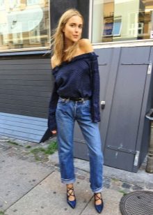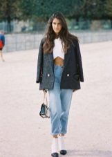 An excellent tandem create jeans shortened length with sneakers. But it is better to wear them without socks or with short models, so as not to spoil the fashionable silhouette. Another solution - cloth sneakers. And also it is worth remembering about high-heeled shoes, which will be indispensable for creating a spectacular bow.