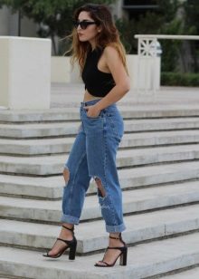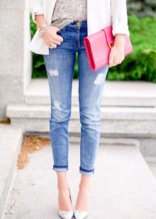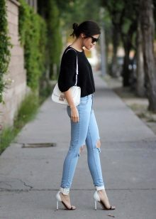 To embody the youth image is to give preference to jeans with faded or holes. They look great in tandem with a bright T-shirt, decorated with a unique print. Stiletto sandals will lend a slim silhouette.