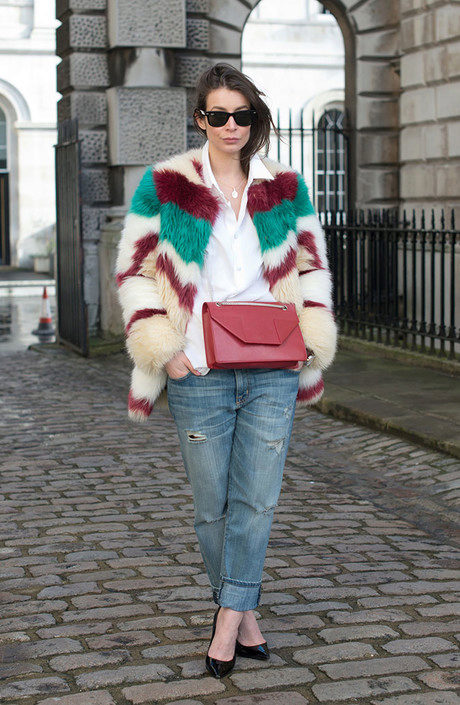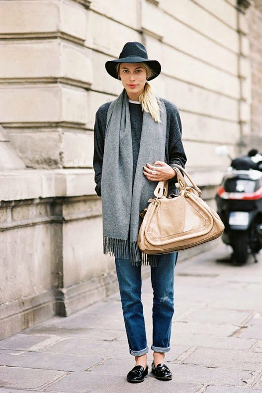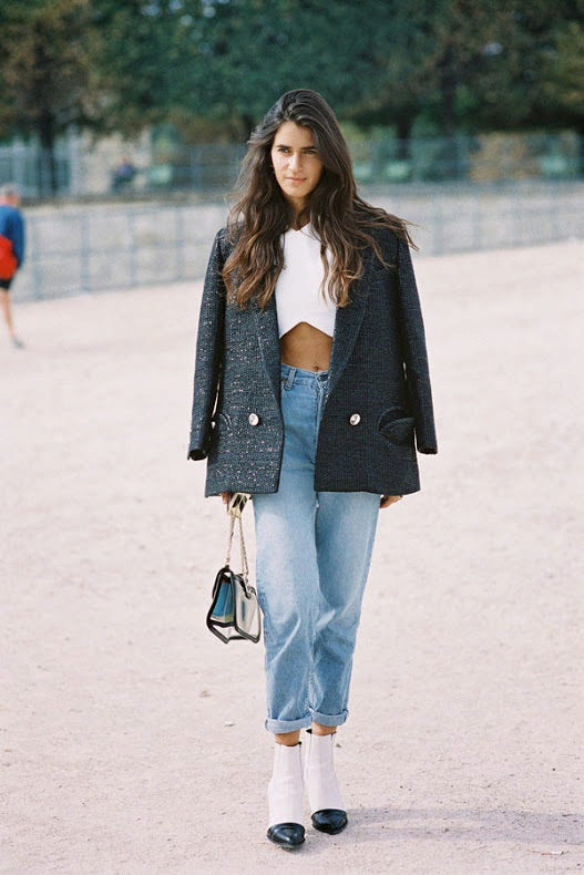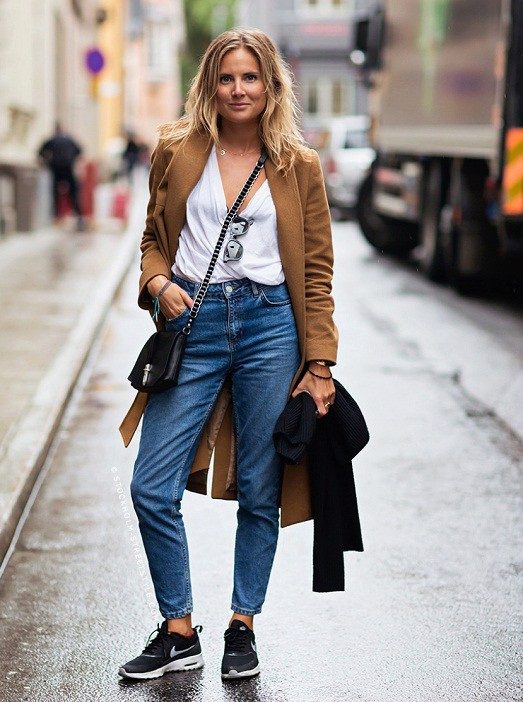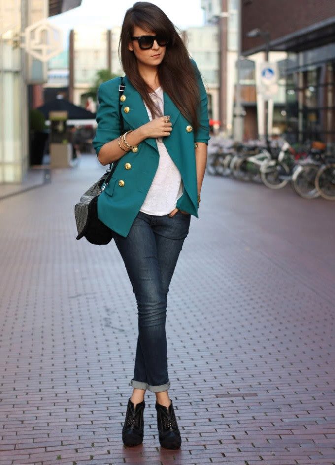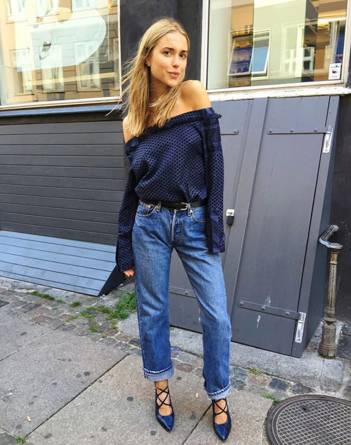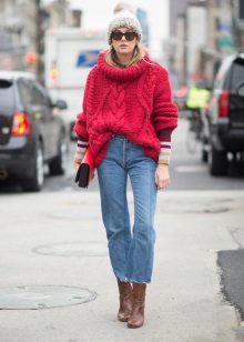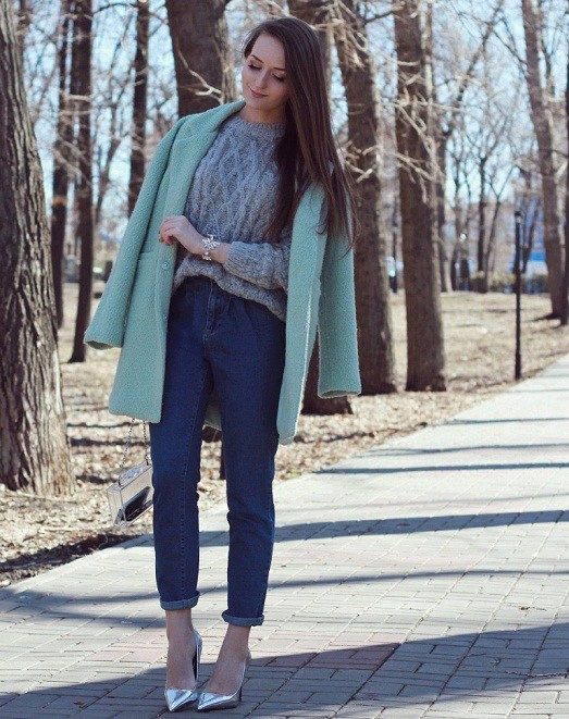 Jeans with a narrower or skintight cut will look beautiful in volume top. You can pick up tops, blouses, tunics, sweatshirts or cardigans.