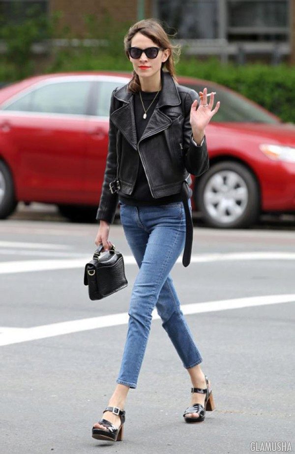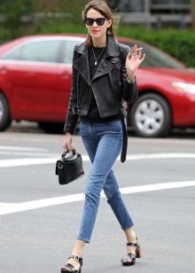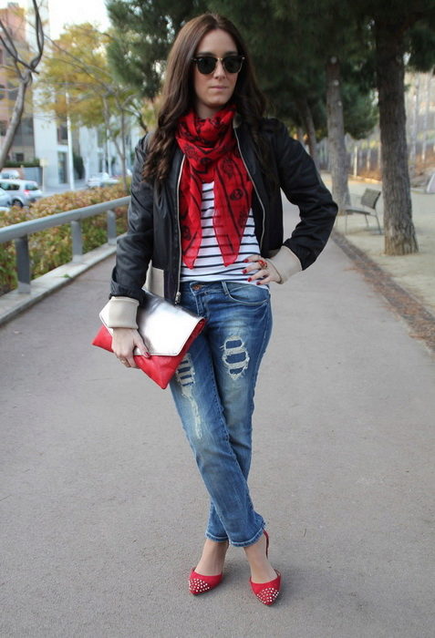 For a casual look with cropped jeans, you can wear a striped shirt and a black leather jacket. Red-heeled sandals will become a fashionable accent that will accentuate a luxurious scarf that matches the tone of the shoe. The clutch bag of red color will be the addition of the unique bow.
