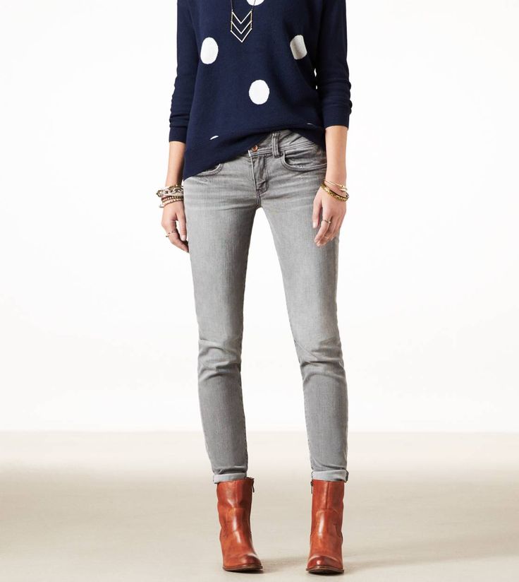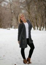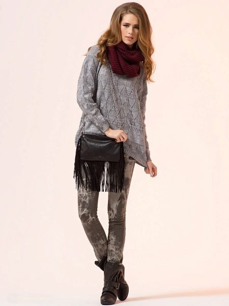 For a gray jeggings, you can wear a loose, wide sweater with a lighter shade. As an accessory, a volumetric scarf and a black bag with a fringe are used.