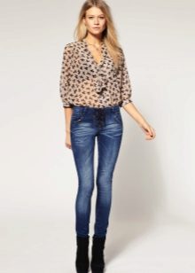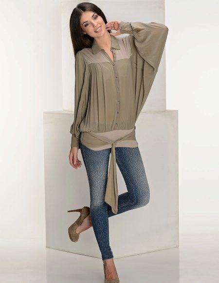 High-waisted styling jeggings look great with short tops or blouses. If the figure does not have ideal proportions, then short tops can be replaced with elongated jumpers, loose tunics or sweaters.