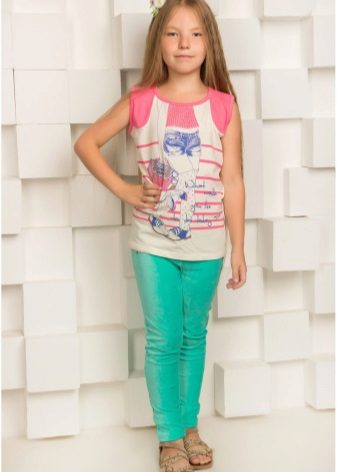 Children's jeggings are performed in the classic range of jeans (black, blue, gray), and in the most fashionable and bright colors. Especially popular jaggins, decorated with small and large floral print. Jeggings can be made in delicate colors, for example, sand, pale pink, blue or mint. And there may be bright cowberry, lilac, turquoise or light green.