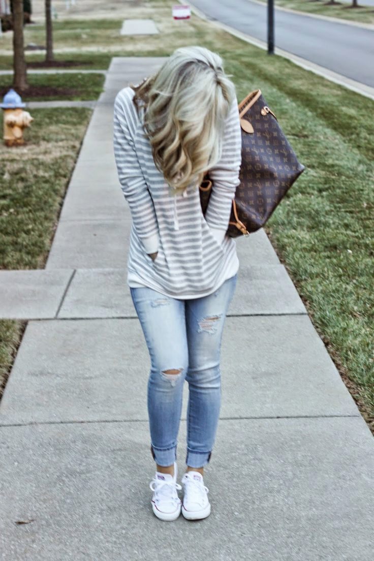 Blue jeggings fit perfectly with a black and white striped jumper. The image is complemented by a light pale pink face.
