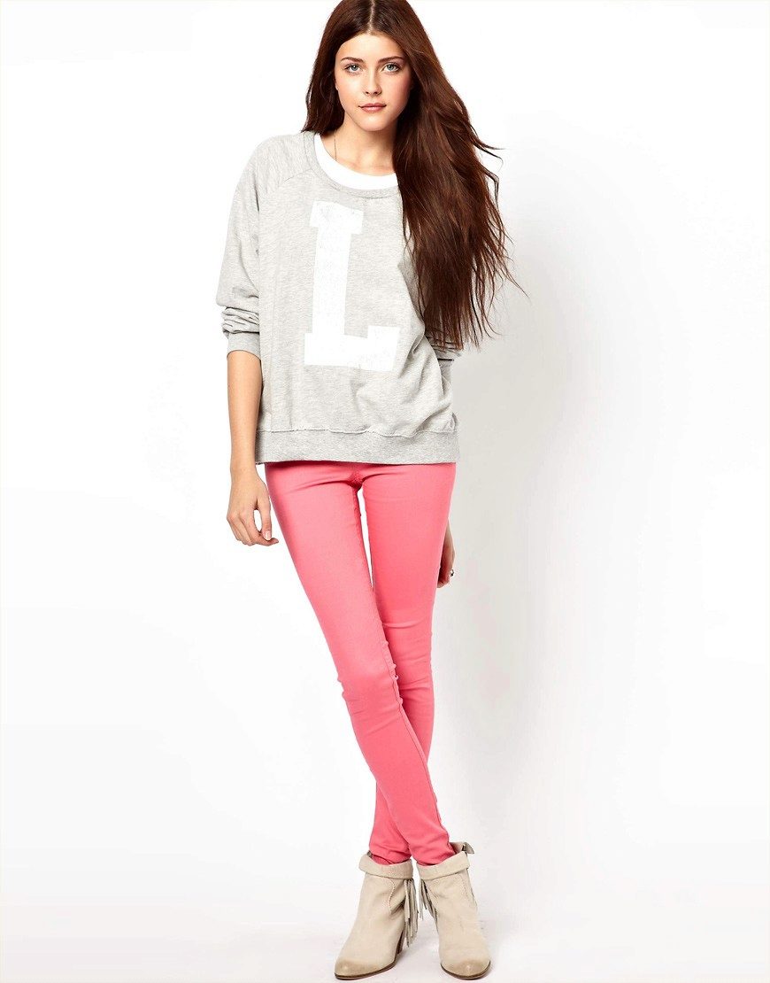 For a more elegant image, you can use coral-pink juggins with a jumper, made in bright colors.