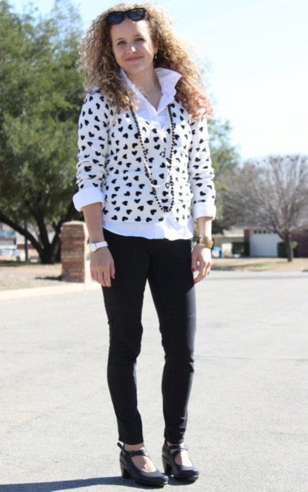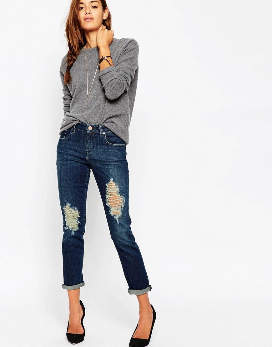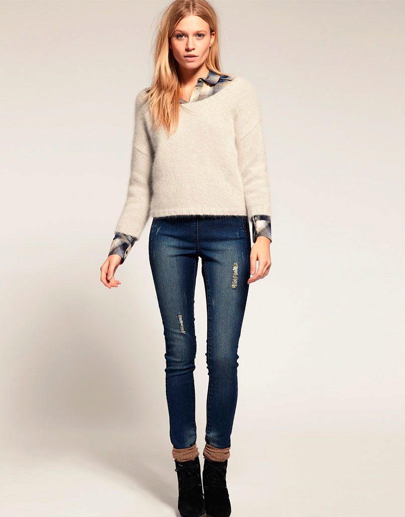 A great look for every day: blue jaggins + elegant jumper with bat sleeves. Complement the image of beautiful high-heeled shoes to match the jumper.