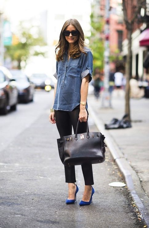 Whitewashed ripped jeggings combine perfectly with a blue denim shirt and color-contrasting shoes.