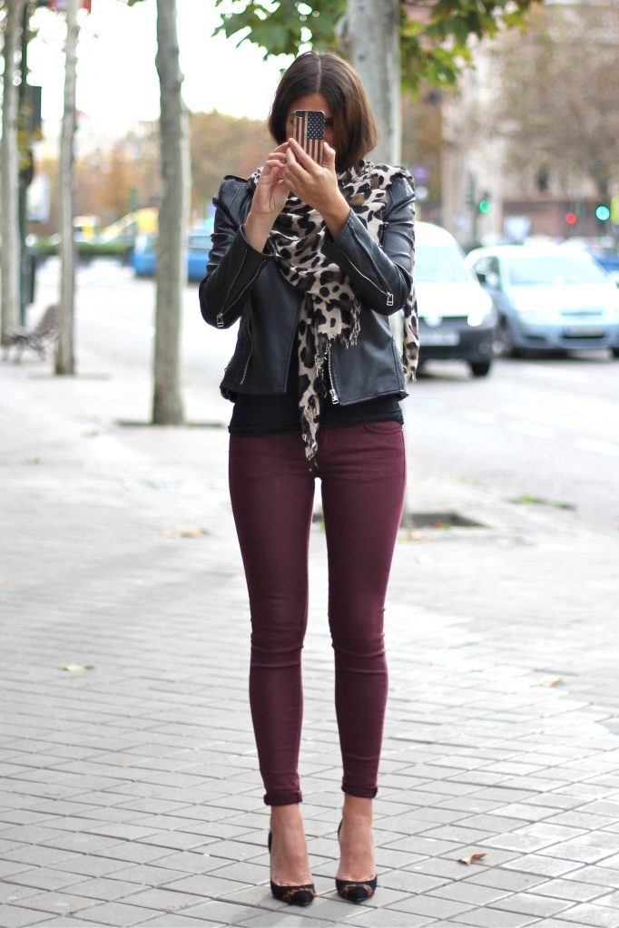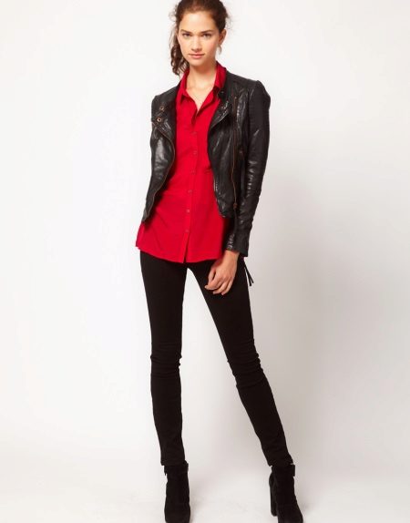 Classic black jeggings are a great base for creating a business image. They are a great fit bright red blouse and a stylish black jacket.