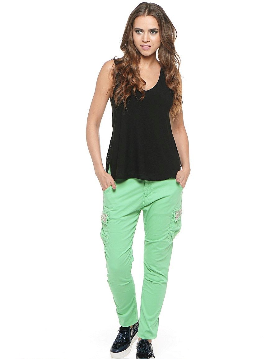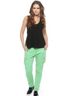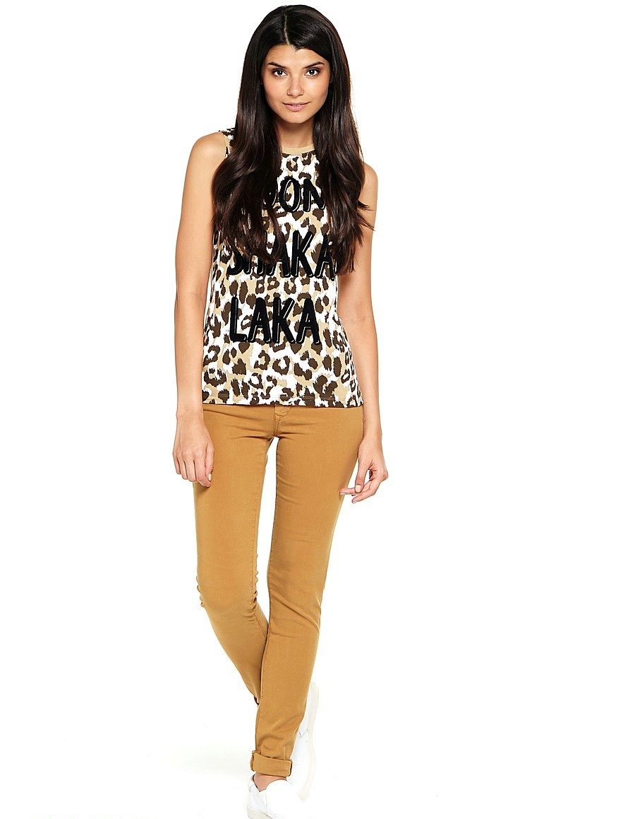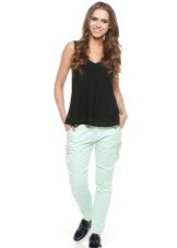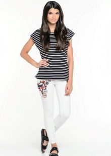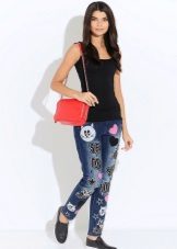 - Dark blue skinny pants fit the body tightly, as the model has polyester and elastane. An interesting detail - the corporate logo on the back pocket, lined with rhinestones.
