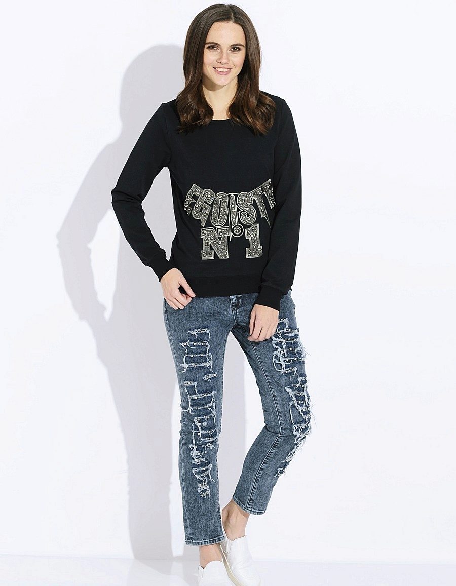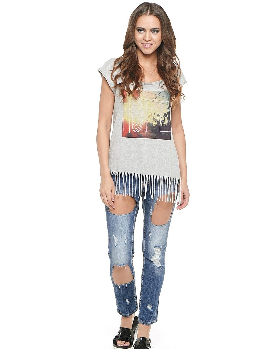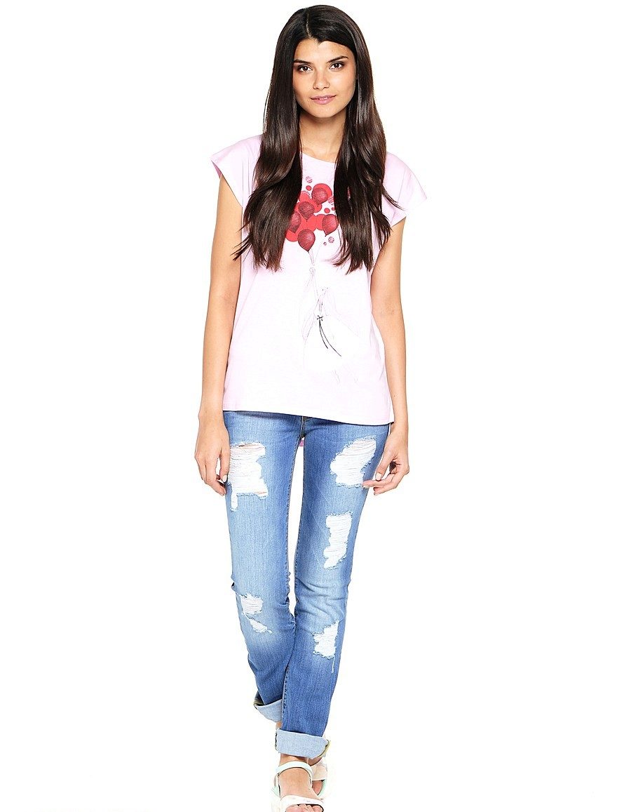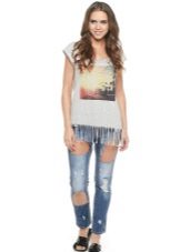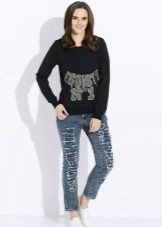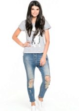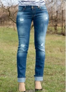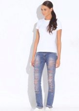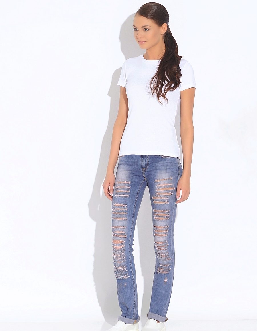 - Straight pants from light blue denim with a scuff effect and small tears. The advantage of this model is that it consists of 100% cotton.