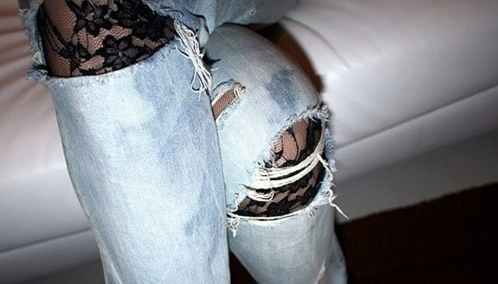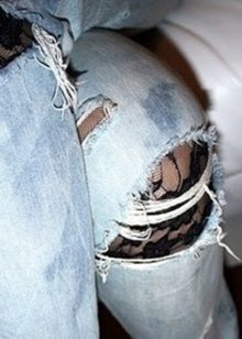 Another original method of playing with holes on jeans is to decorate them with lace fabric inserts. The combination of rough jeans and fine lace looks incredibly impressive.