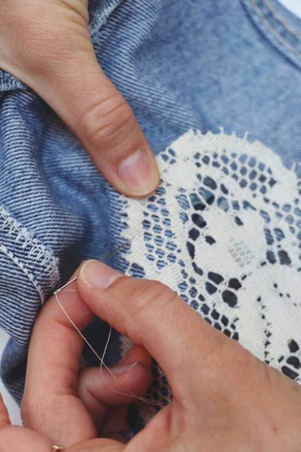 Sew on lace inserts should be the same as regular patches - from the wrong side of the pants. Only sweep the edges of the hole is not necessary. You can even slightly break it to the desired size and make at the edges of a careless fringe.