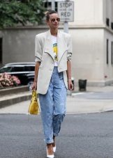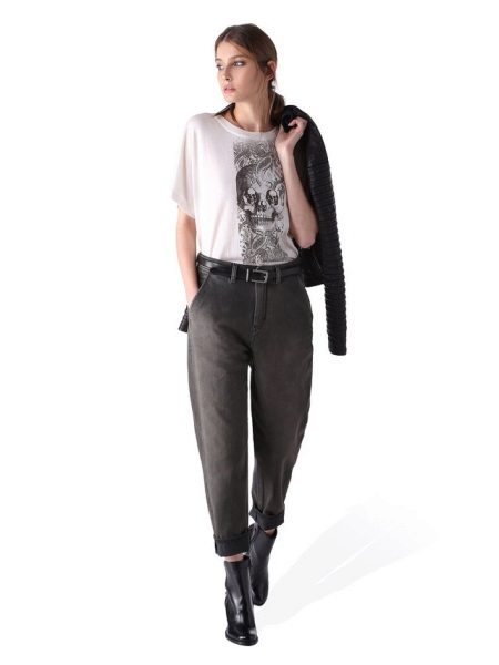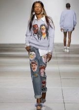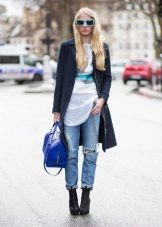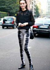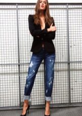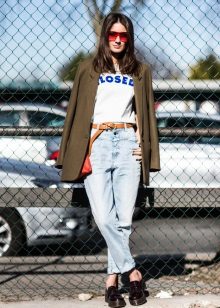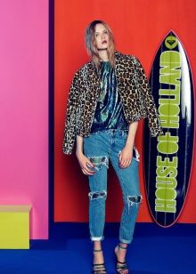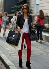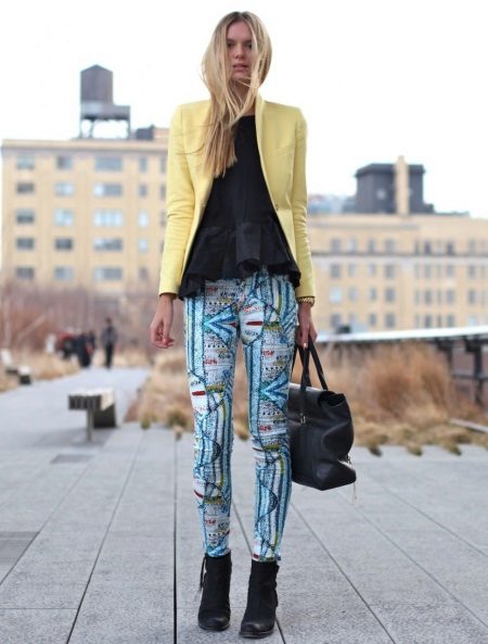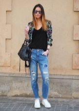 Youth and bold image will be combined with skinny jeans with T-shirts decorated with large print (photos, drawings, etc.) and sneakers.