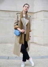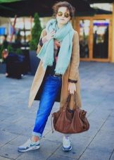 In such a dress would be appropriate monochromatic T-shirt or sweatshirt with a print, repeating the palette used in sneakers. It is important to remember that a massive leather bag (black or brown) still looks very stylish in this season in such a dress.