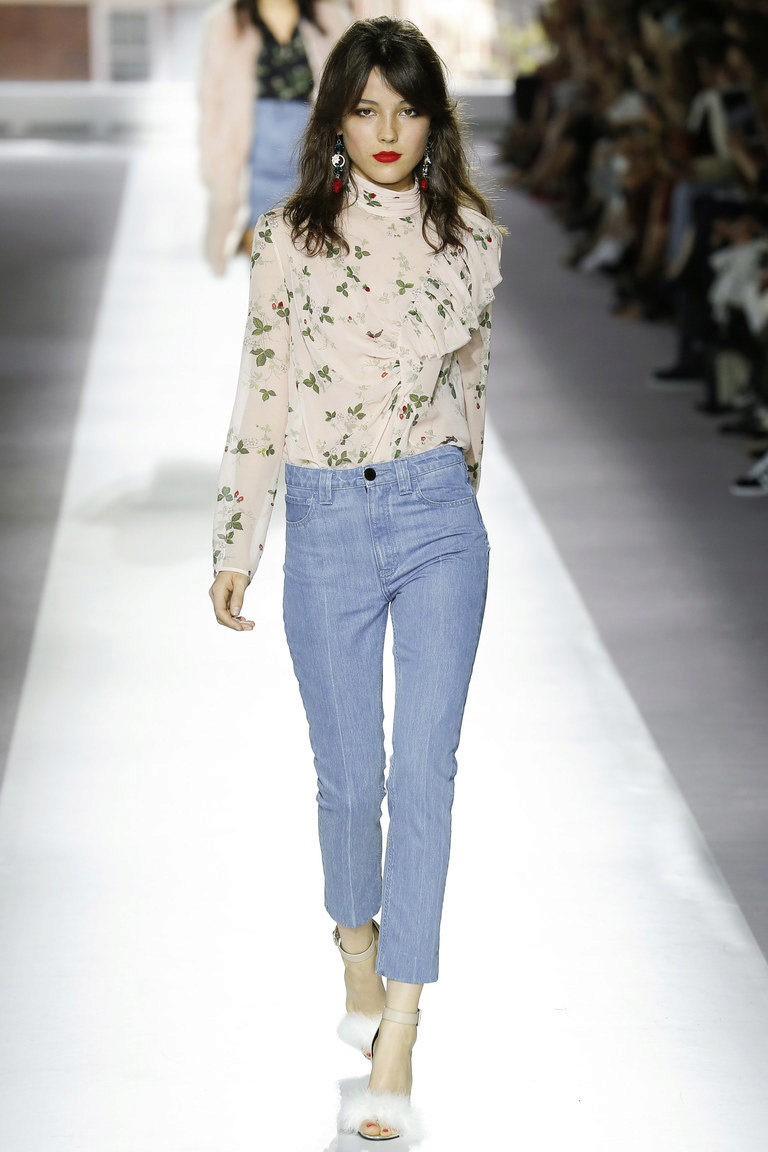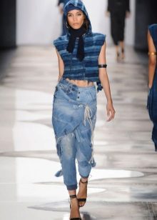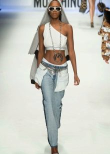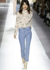 Jeans with a very high fit change the silhouette beyond recognition. They give a seductive look, visually pull the entire figure.
