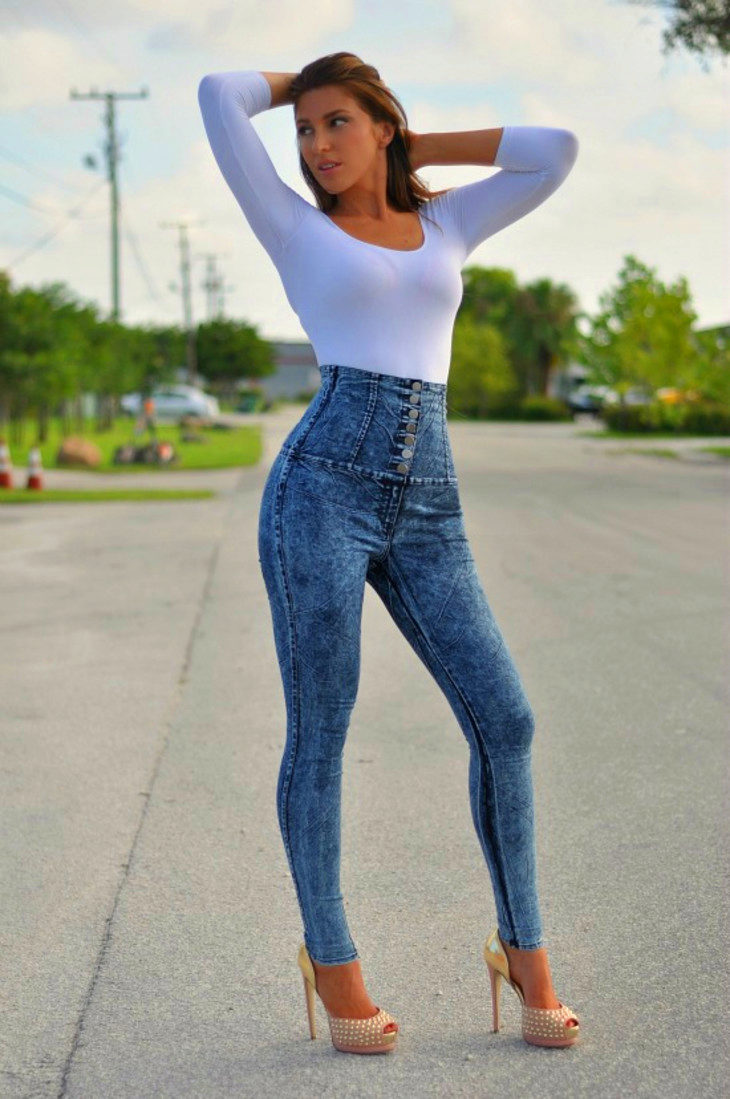 A great option for girls with a perfect waist - skinny jeans with a high belt.