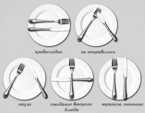 - In the intervals between meals, the fork and knife are not left on the tablecloth, but put on a plate crosswise. Between the change of dishes, the fork and knife are also left on an empty plate, but already parallel to each other, while the knife is placed to the right of the fork.