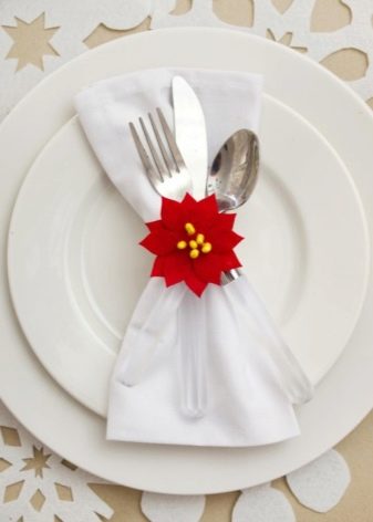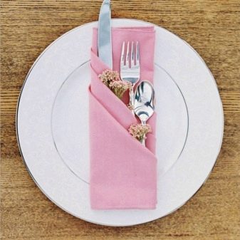 In addition to the placement of forks and spoons, it is also possible to decorate a napkin with its spruce twig, flower, dried autumn or fresh juicy leaf or another.