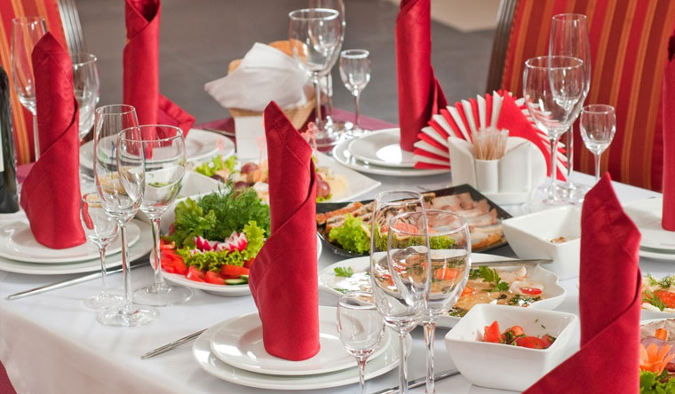 If textiles are used for serving the table that is not filled with food, then it is placed on the top plate. If the treats are already on the table, then the napkin is placed to the left of the plate. Sometimes they are put into rings, tied with a ribbon, put in cutlery, or put in a glass.
