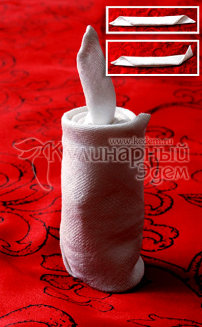 The green napkin folds in half in a triangle, then the action is repeated two more times and the resulting shape is put in a glass so that the sheets look out over the edges. The red napkin needs to be folded into a rectangle and rolled into a bud, and then placed on the foliage.