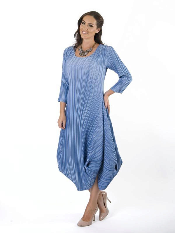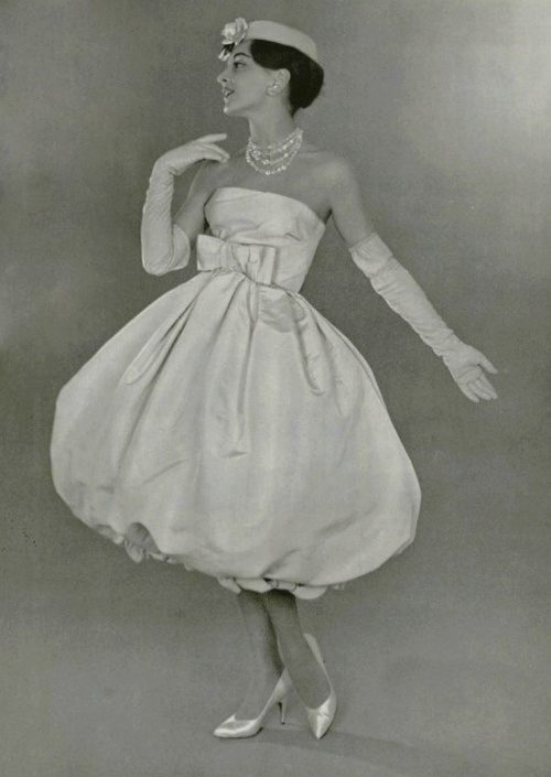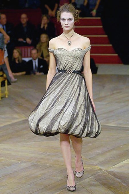 - Balloon dress with flared skirt Today it looks not quite usual, but in the XX century such a dress was very popular. The volume is created at the same time due to a shortened lining and a large number of folds gathered at the waist.