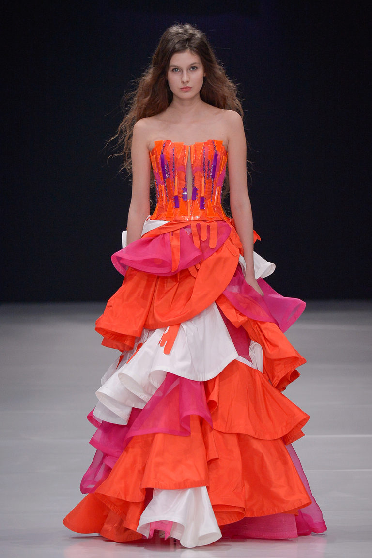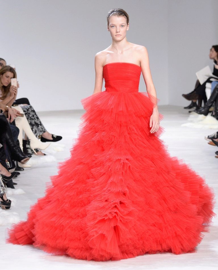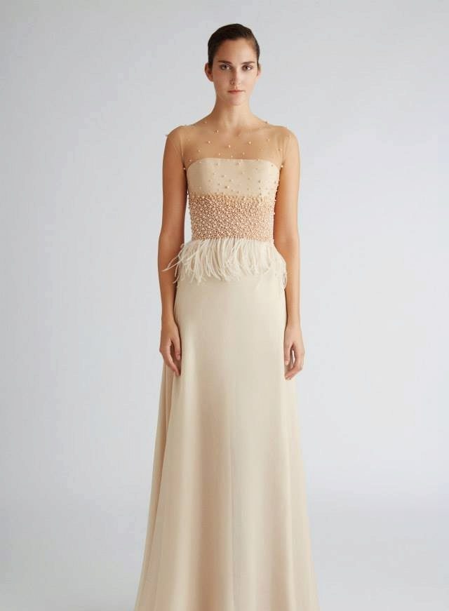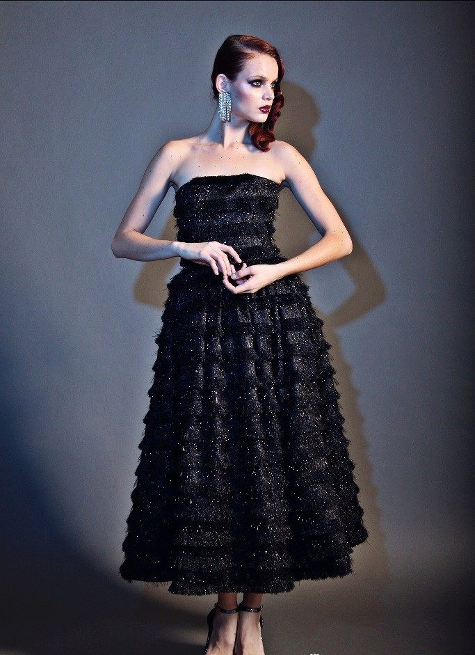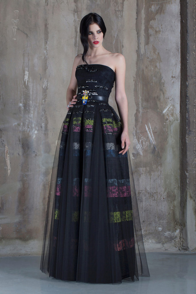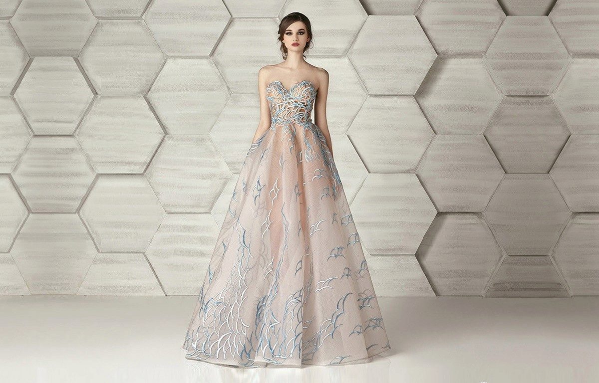 Evening dresses are often decorated with sequins and stones, appliqué and lace, frill and fringe, embroidery and drapery.