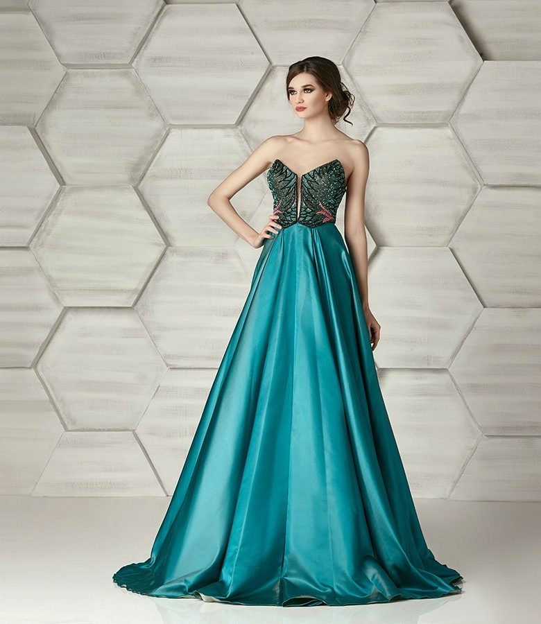 The appearance of a strapless A-line dress in the wardrobe will be a winning one for both slender and full-bodied girls. His style is perfectly beaten by a combination of a trapezoidal skirt and a regular bodice.
