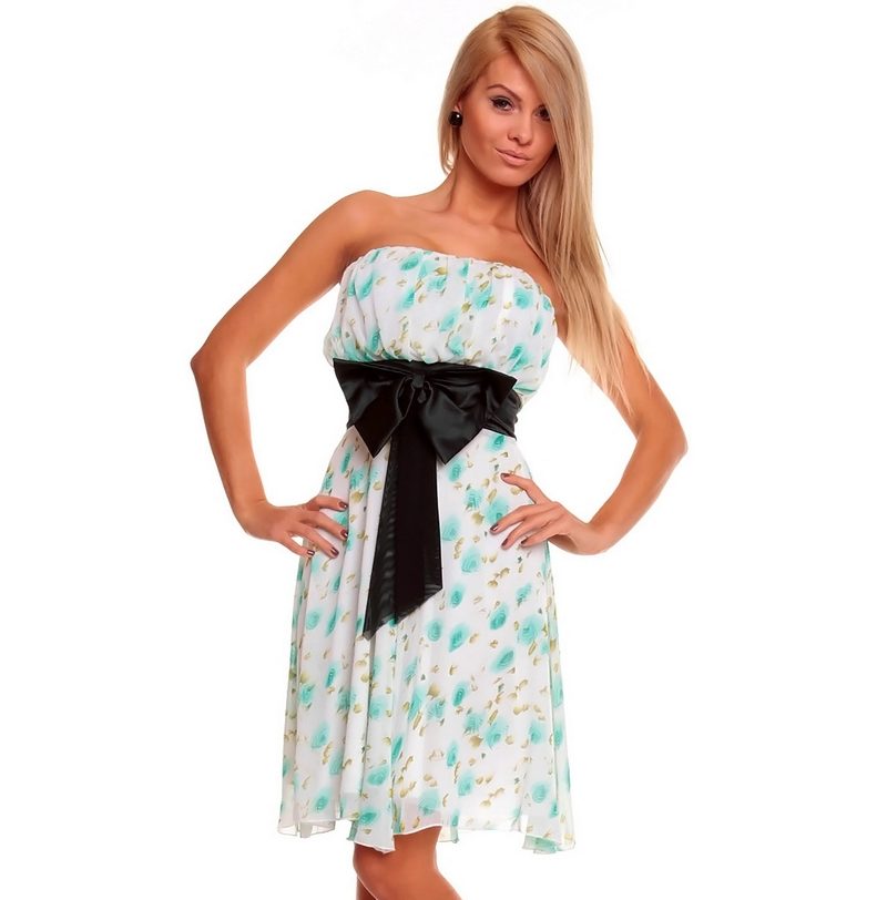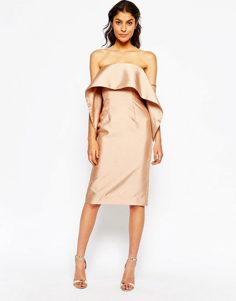 - Dresses that have bare shoulders. These may be dresses with a neckline or with thin straps. In these dresses you can emphasize the bust of a small size and visually make the shoulders more voluminous. The skirt for such dresses is preferable wide, medium length or mid-calf.