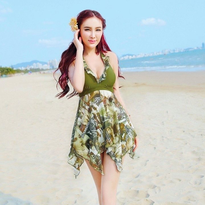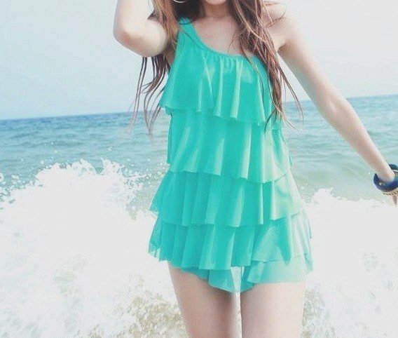 Swimwear with long skirt more like an ordinary summer dress. The skirt usually comes to mid-thigh, but for some models it ends at the knee level. With the help of such a bathing dress, you can easily disguise the fullness in the hips or cellulite.