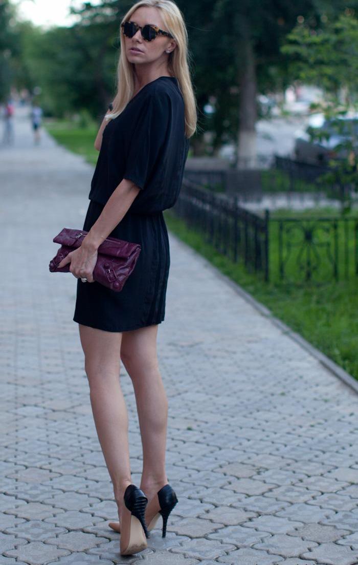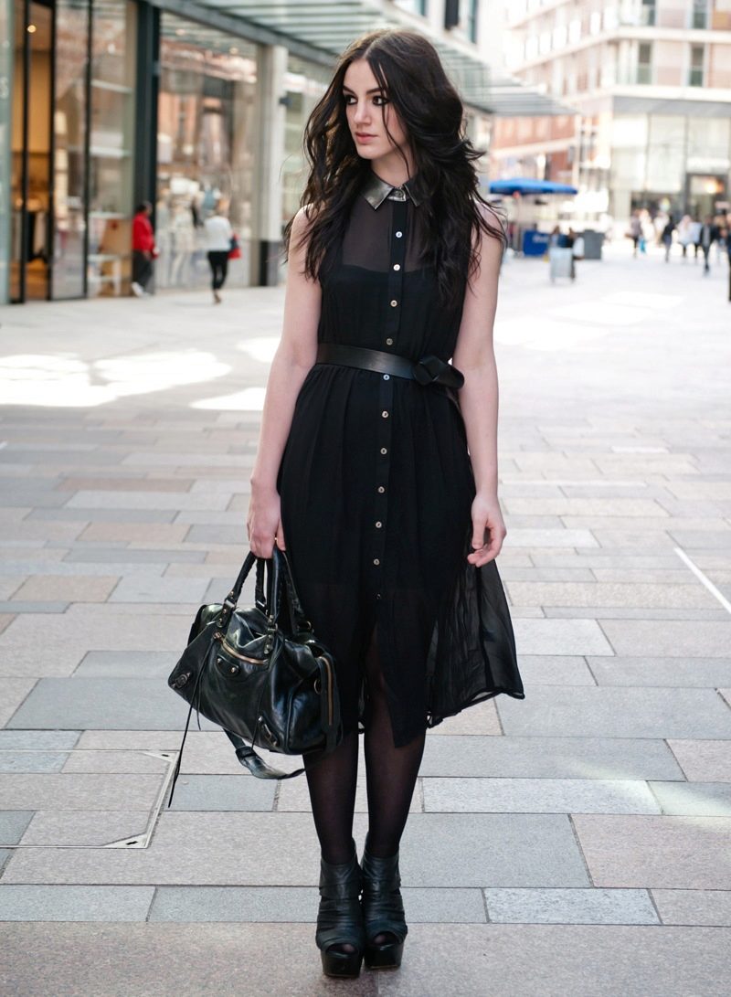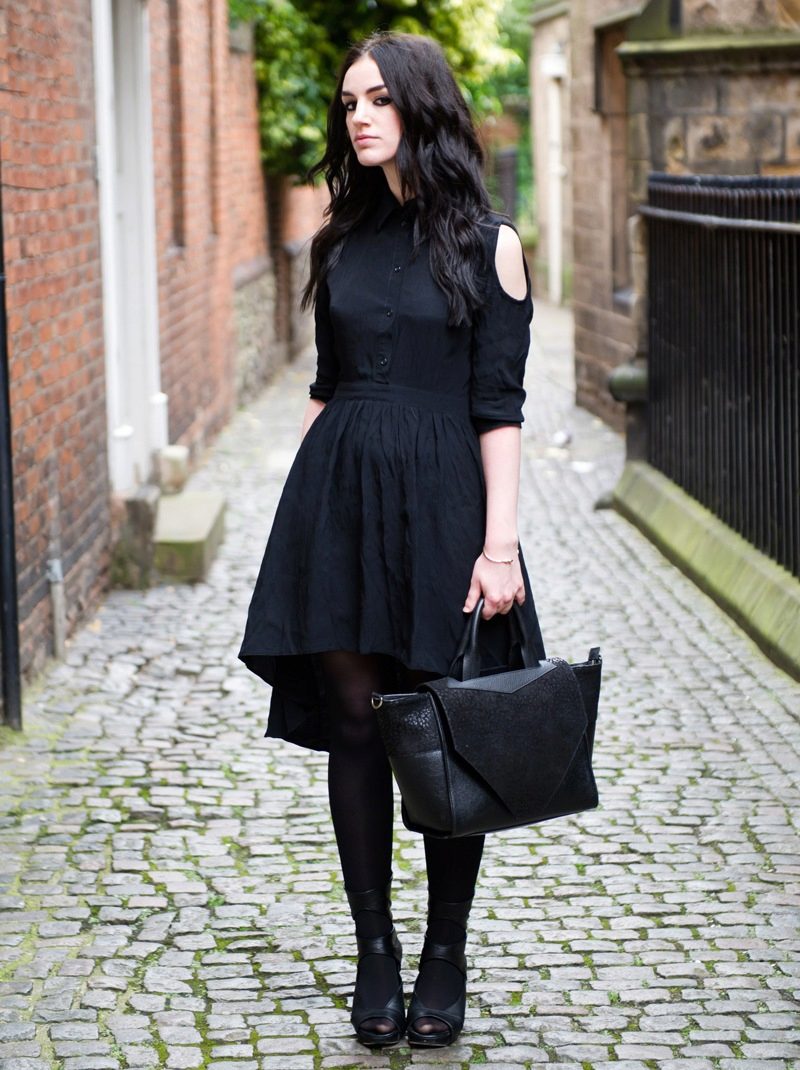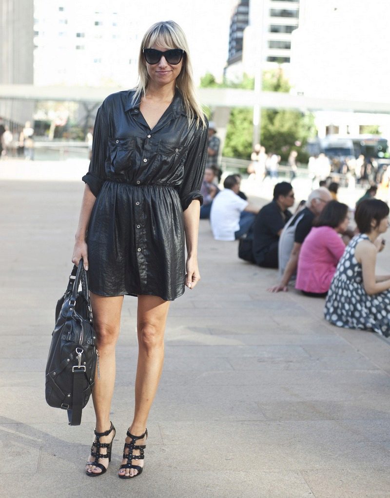 An interesting evening option would also be a black dress shirt to the floor.Put on his heel shoes, make a festive styling and pick up a small handbag. Leave a few buttons at the top and bottom unbuttoned.