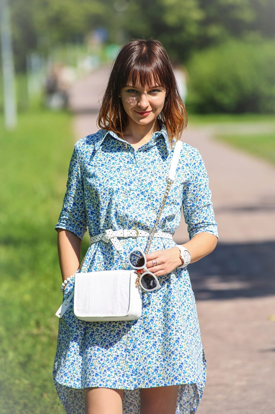 The best color of accessories for a white shirt dress will be beige, black or brown.