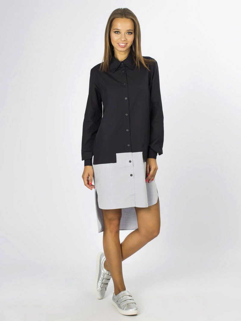 Since the dress-shirt has a characteristic collar, such an outfit is quite appropriate as a business dress. Especially if you pick up the product in a low-key colors and without additional finishing. The business dress shirt is predominantly average length, as well as the closed top. It is combined with a leather bag and a stylish leather belt.