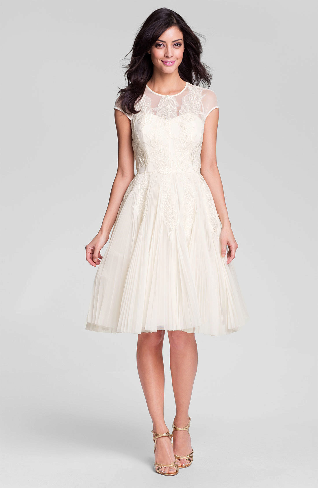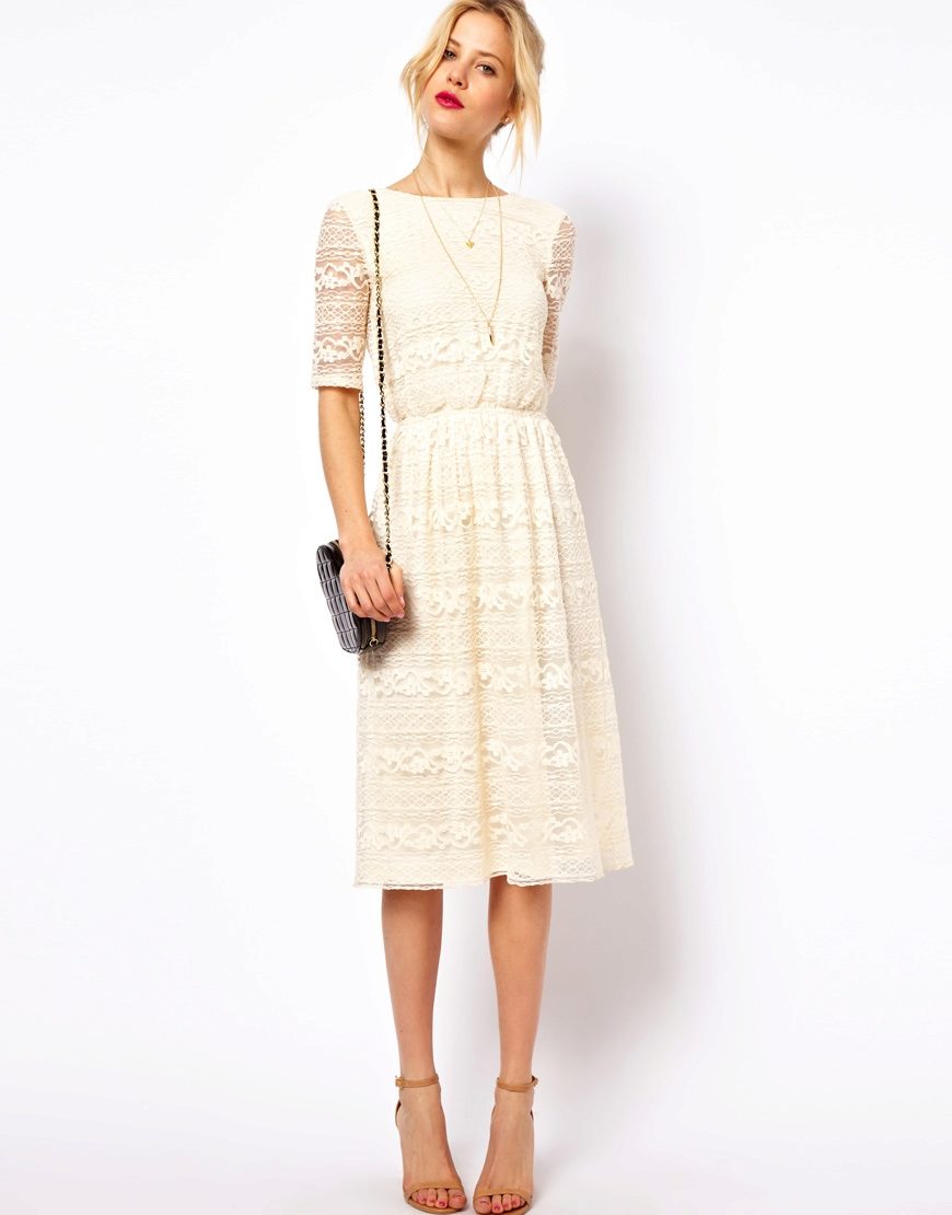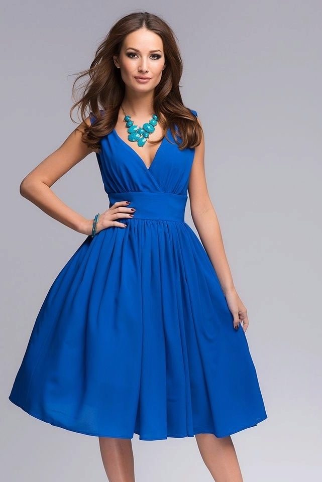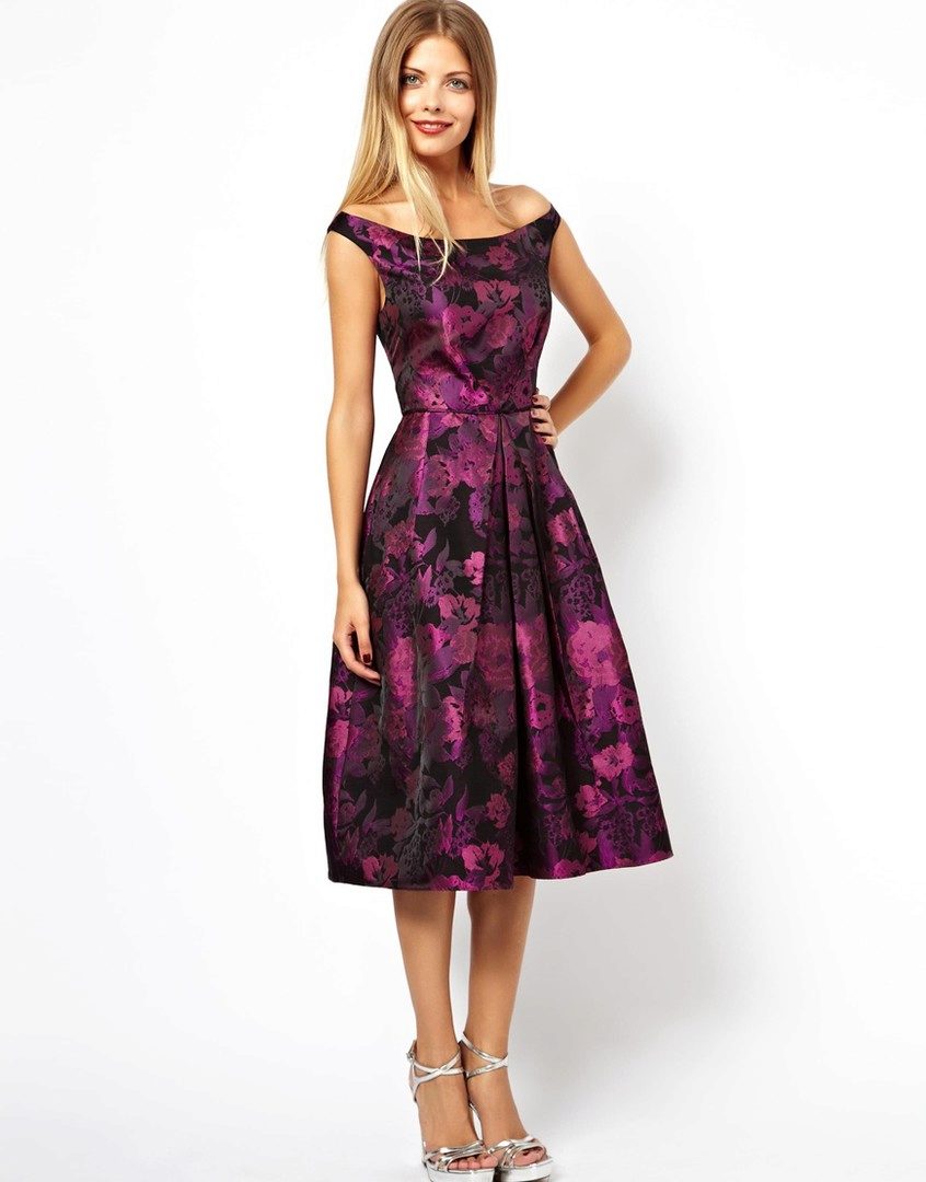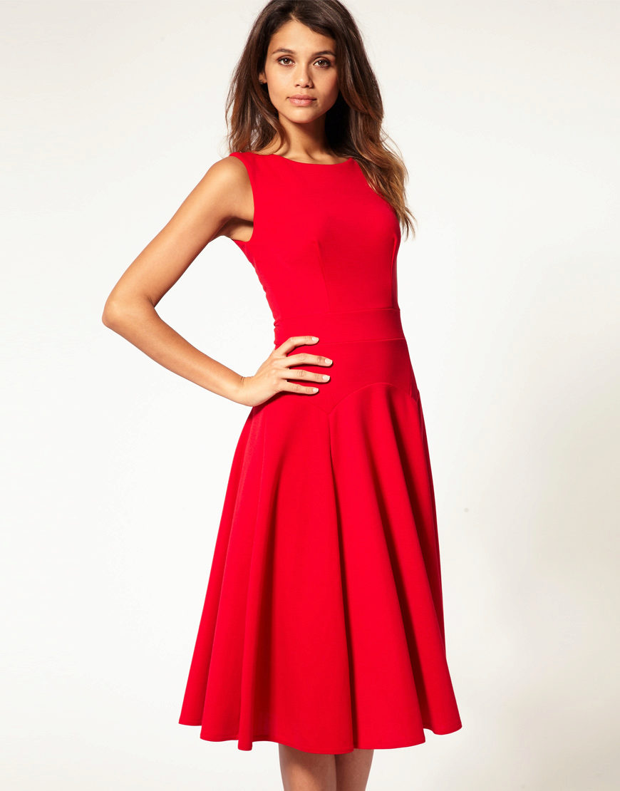 Midi length flared skirt dresses are a great solution for a party or semi-formal event. An atlas, chiffon or silk is perfect for this outfit.