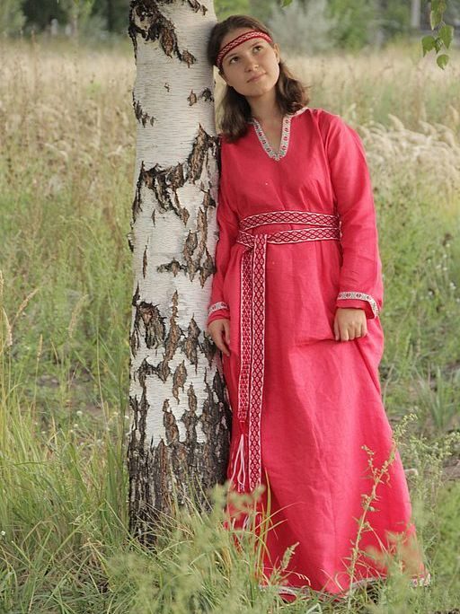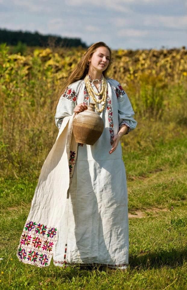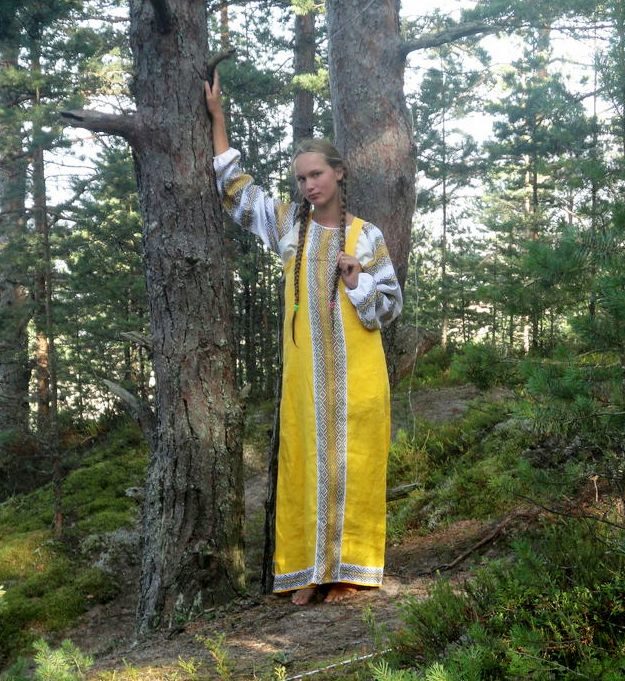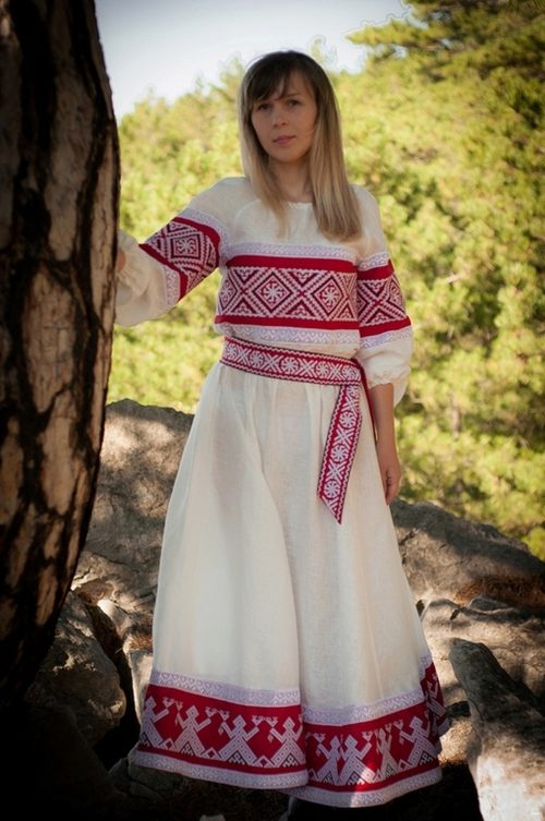 - Tunic-like sundress, which has no middle seam. This outfit was also called deaf, because it was sewn from a single piece of cloth and side panels. This type of sundress is the most ancient. The front cut-out was usually small, rectangular or round. Also there was often a small incision in it, on which there were strings or a fastener on a button. For tailoring deaf sundresses used cloth, canvas and other homespun cloths. On the hem, armholes for hands and necklines, the items were trimmed with a bucket, painted canvas, applique or embroidery in the form of narrow strips.