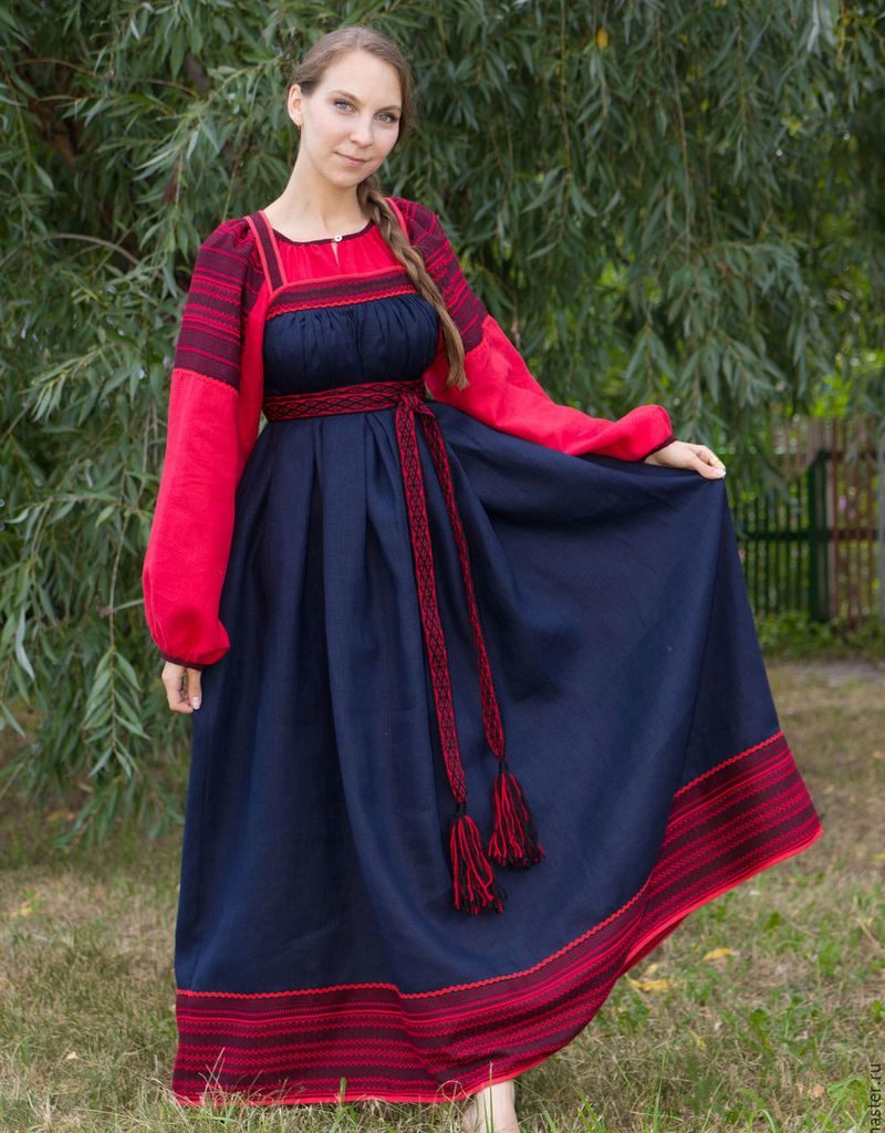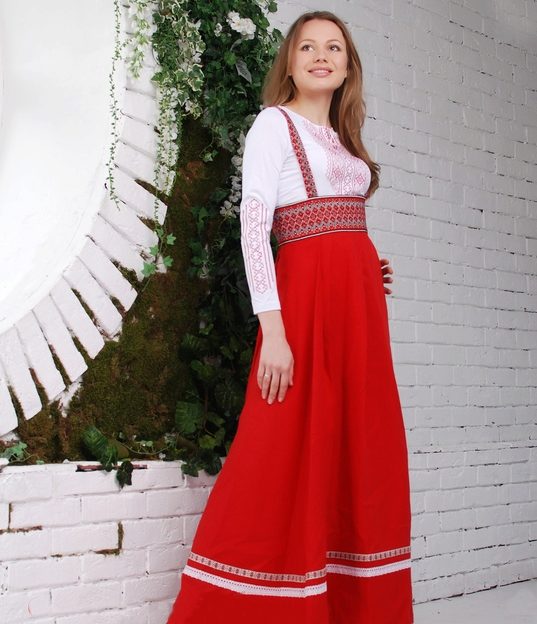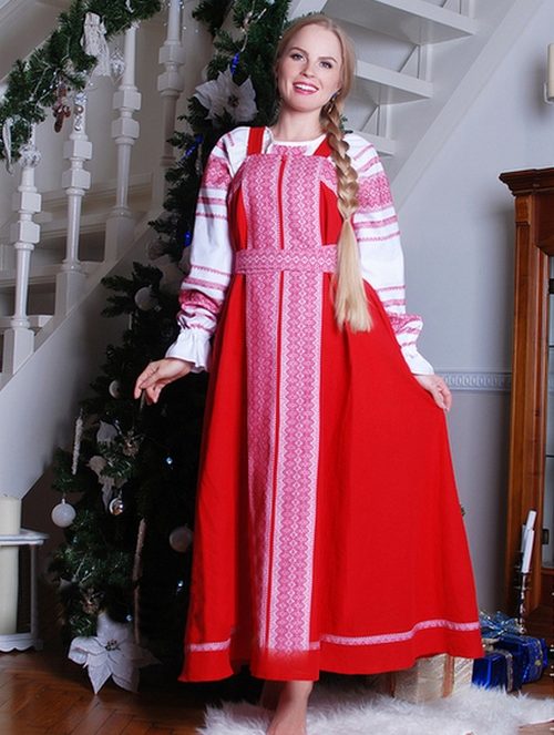 In a Russian sundress, a woman of any body size and any age will look attractive and original. Due to the free cut such clothes do not constrain movements and completely hide any flaws in the figure.