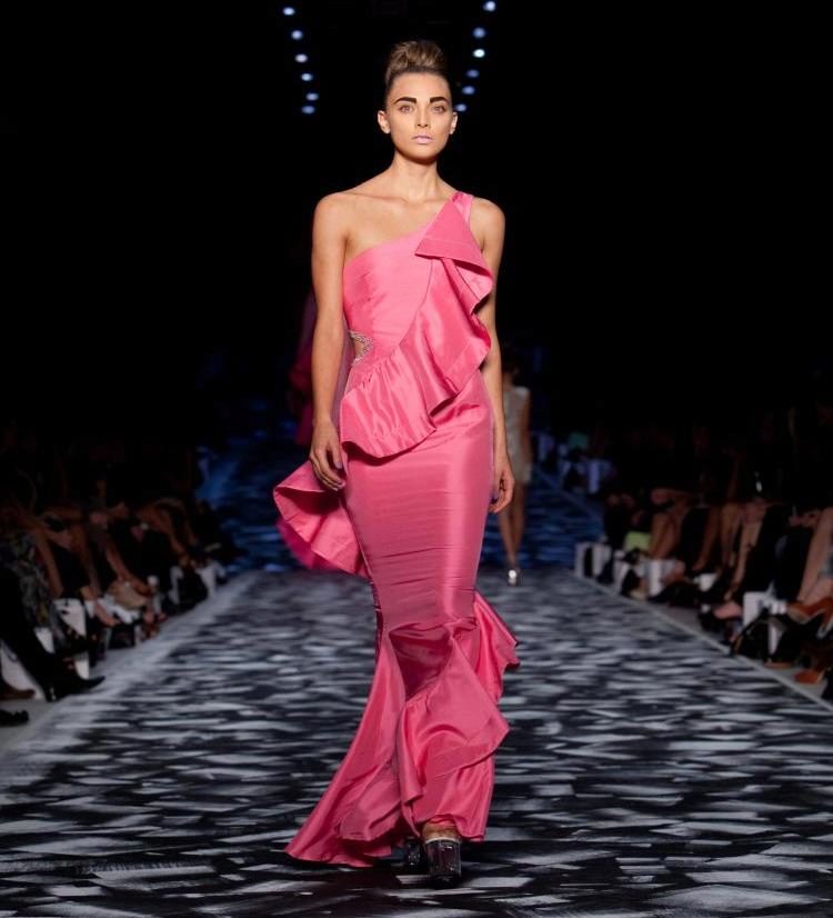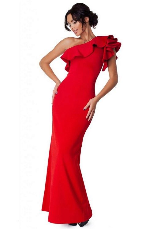 Long evening dresses with an abundance of shuttlecocks are also offered by fashion designers in a large assortment. In some models, frills are distinguished by their color or shape. They are often located asymmetrically. All these dresses have an expensive and elegant look, so they are selected mainly for a festive occasion.