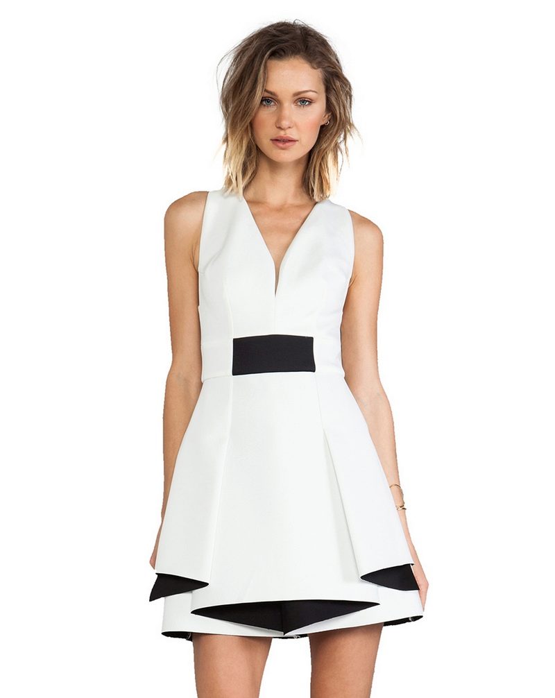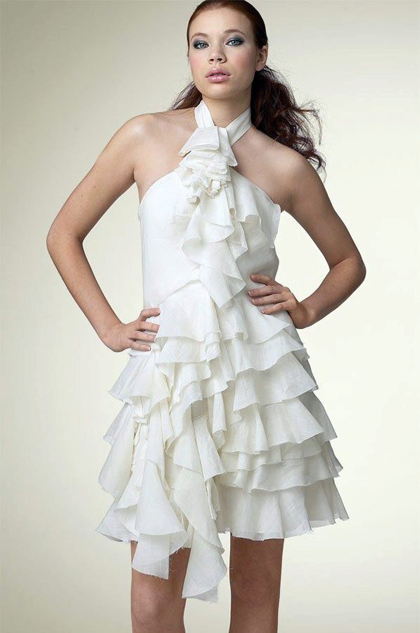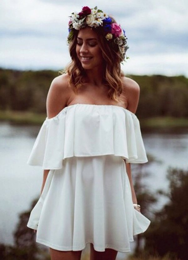 In snow-white dresses with flounces, the girl looks gentle and attractive. These dresses help to shade the golden tan, so they are especially in demand in the summer.
