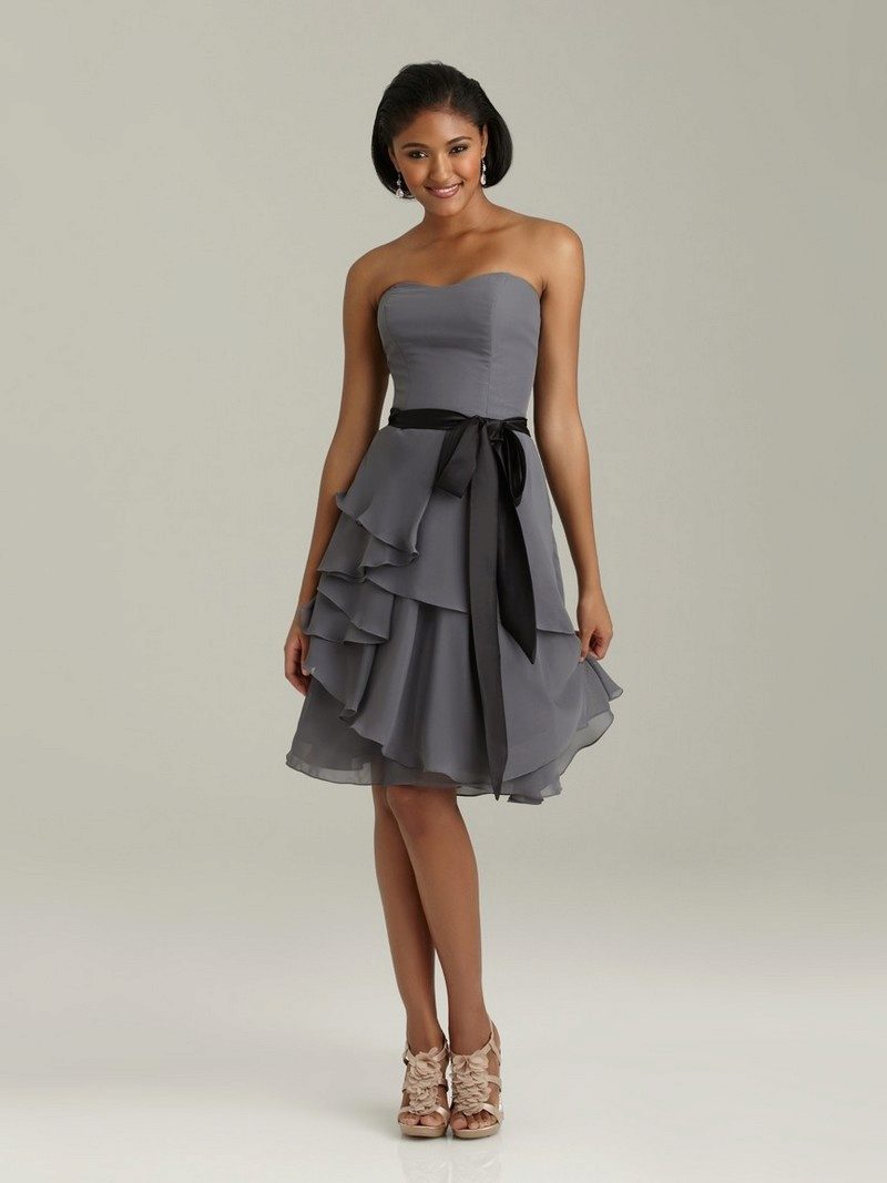Models with flounces of this color look restrained and elegant. A shuttlecock in these dresses may be the only one, for example, on the shoulder or along the hem. Dark blue short silk outfits look very festive.