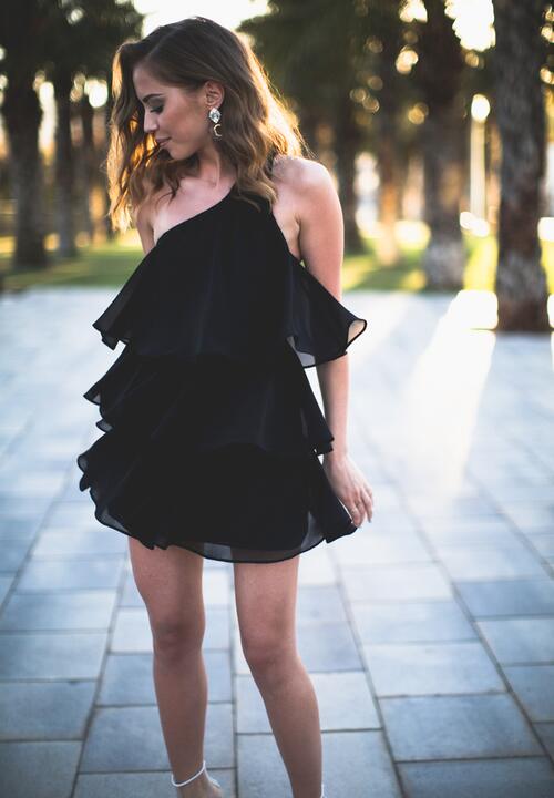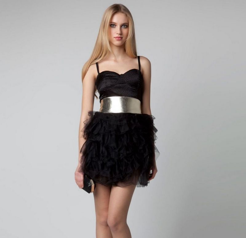 Models with frills in black can serve as a good basis for an evening look, if you add them with expressive accessories. Most often it is a dress with a short length. Flounces in them can be located on the chest or on the hem.