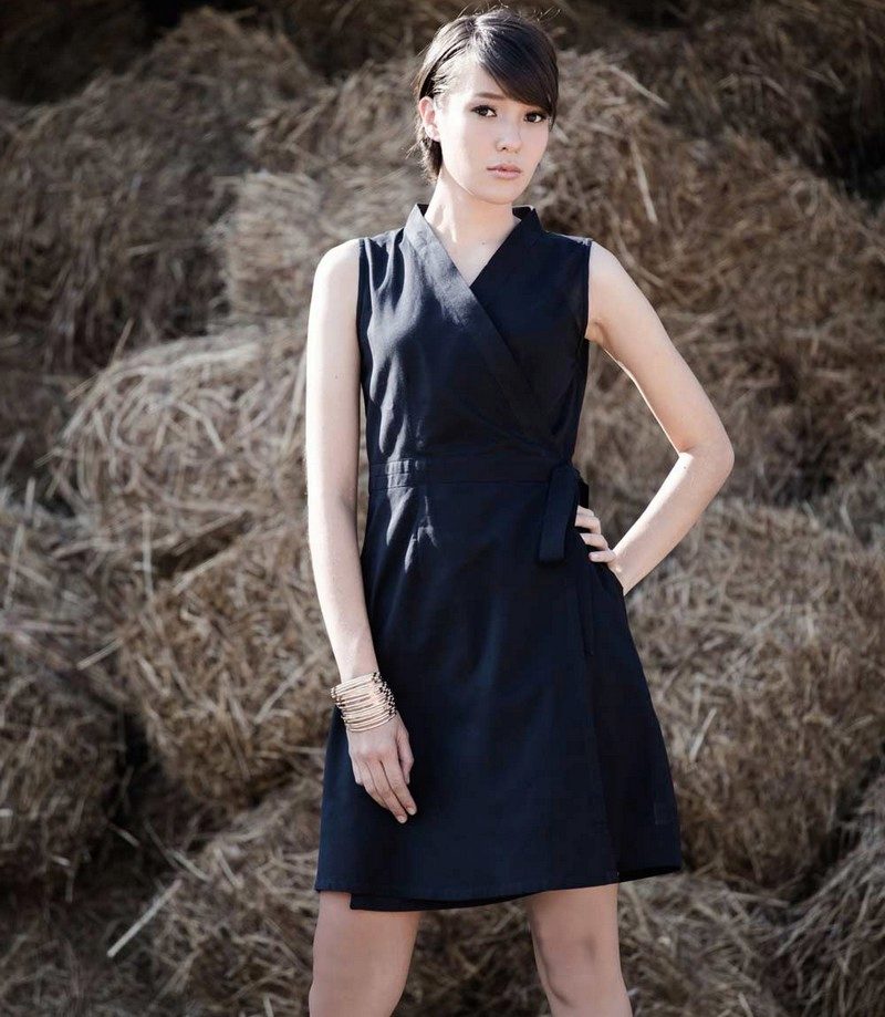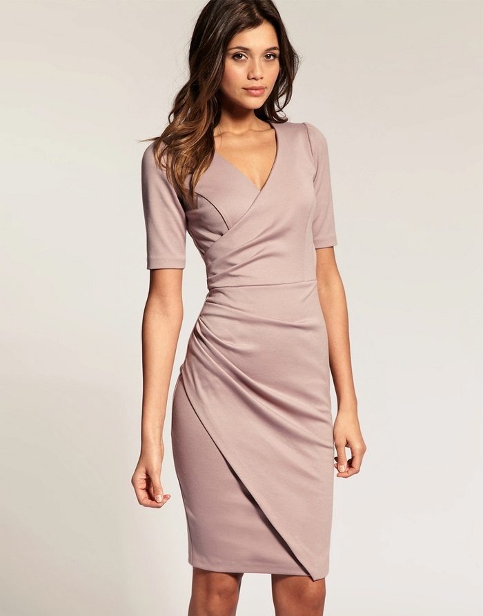 In a dress of this style, the front part is divided into two separate elements. One of them is piled on one side from the top to the second, as a result of which a V-like cut is formed at the dress.