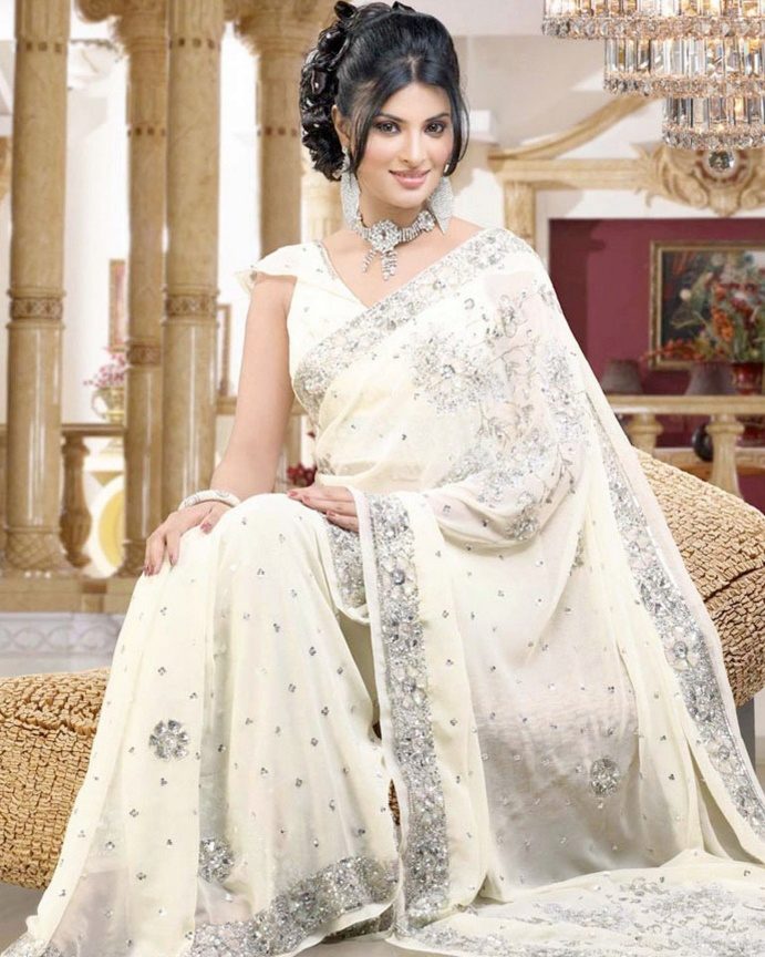 The saris were embroidered with silver, platinum and gold, and then decorated with diamonds, sapphires, rubies, topazes, corals, emeralds and other precious stones.