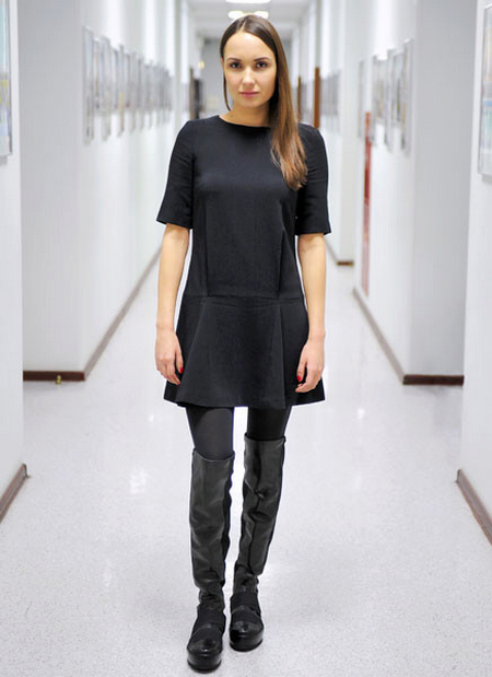 In winter, a spectacular combination of shiftdress with high boots on a flat sole or with a small heel, as well as boots that are worn with tight tights.